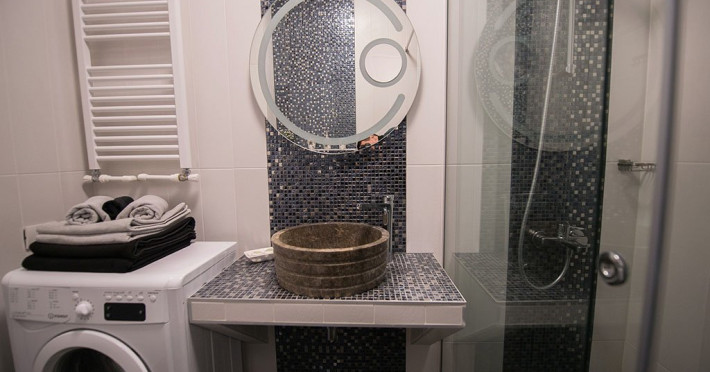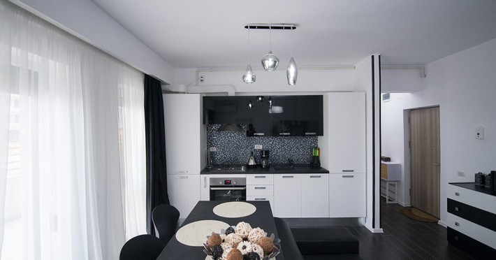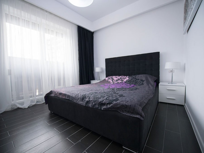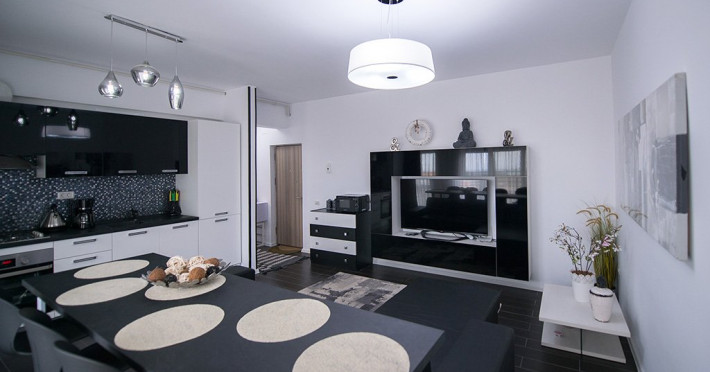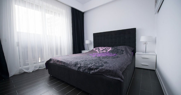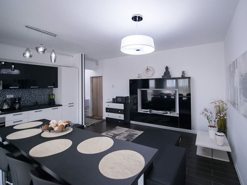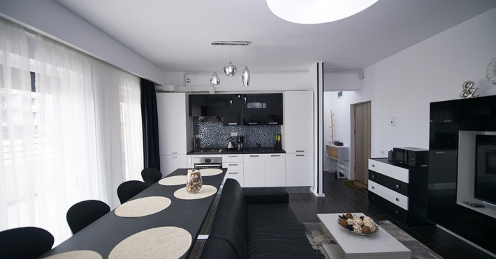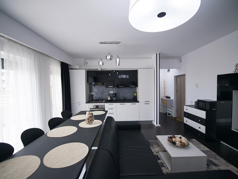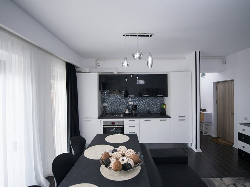 Apartamentul este complet mobilat si utilat intr-un stil modern si confortabil, inclusiv cu living (cu canapea extensibila), dormitor cu pat matrimonial, dressing, aer conditionat, 2 smart TV-uri, bucatarie complet utilata, baie cu cabina de dus, masina de spalat si Wi-Fi gratuit.