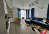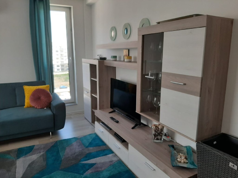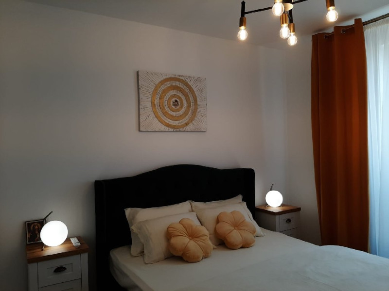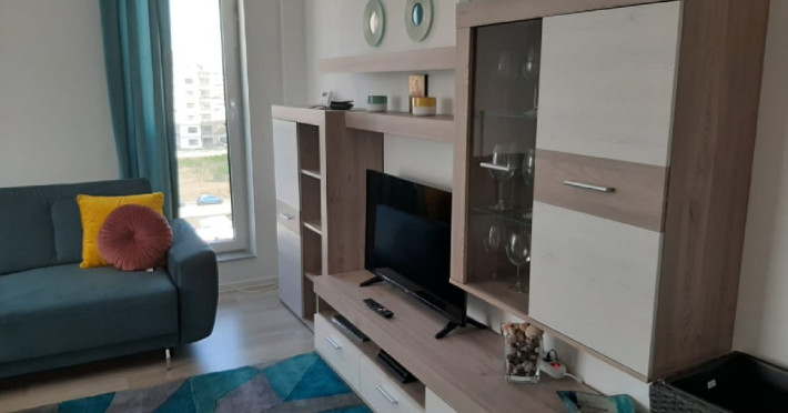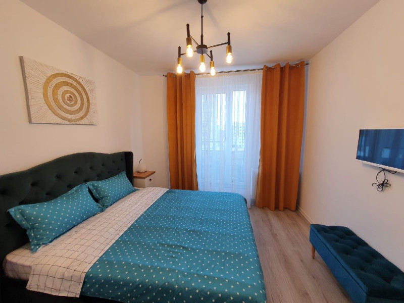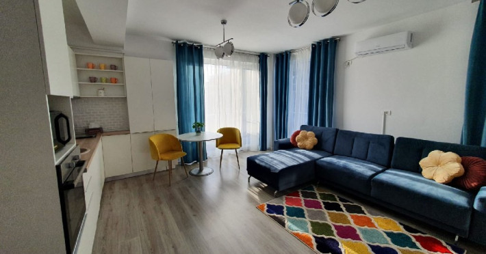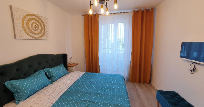 Interiorul este complet mobilat si utilat modern, cu un dormitor ce are un pat matrimonial, un living dotat cu o canapea extensibila. Pentru confortul dumneavoastra, apartamentul este echipat cu aer conditionat si un smart TV. Bucataria complet utilata include o plita, cuptor si frigider.