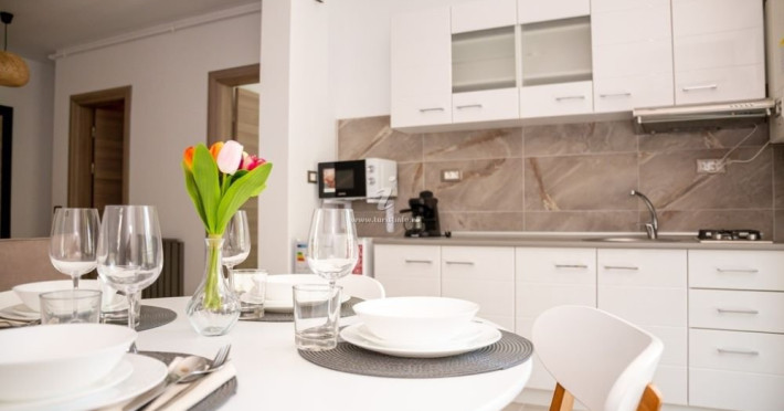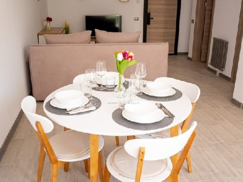 Apartament Mirana Alezzi - este format din living si dormitor. Livingul dispune de canapea extensibila, zona de luat masa, este open space cu bucataria completa utilata (aragaz, frigider, aparat de cafea, cuptor cu microunde), dormitorul este cu pat matrimonial, baie cu cabina de dus si masina de spalat,TV in ambele camere, wifi, aer conditionat, balcon. Suprafata 62 mp. Adresa strada D13 nr. 6, Bl B10, et. 6.