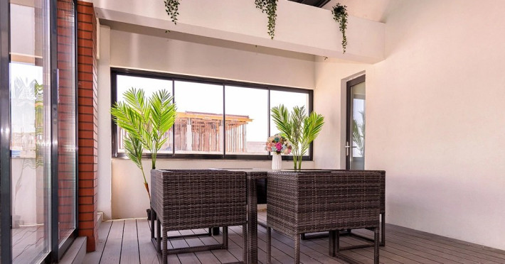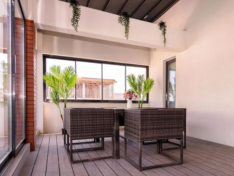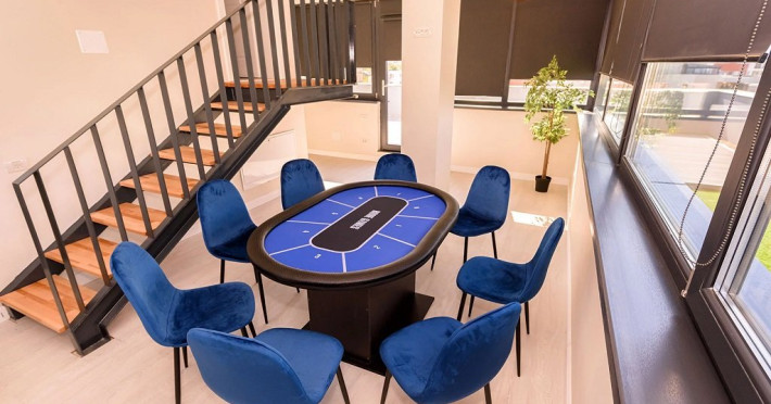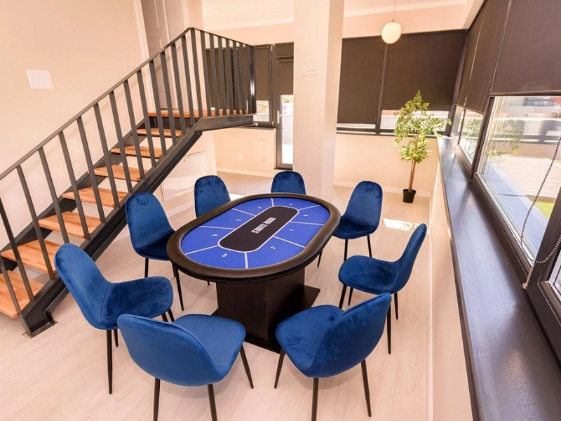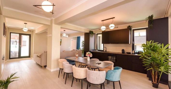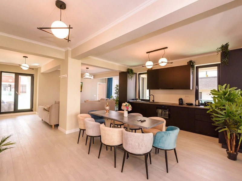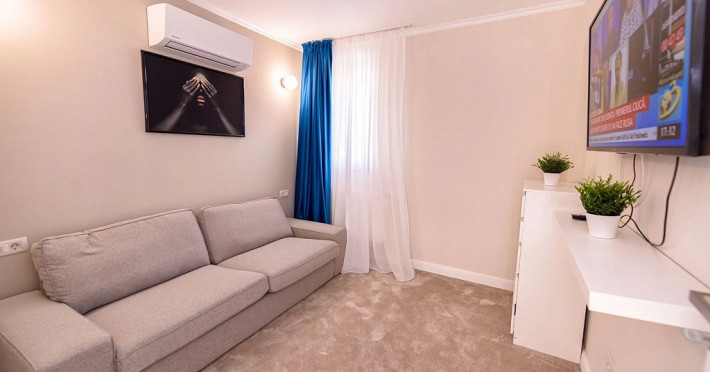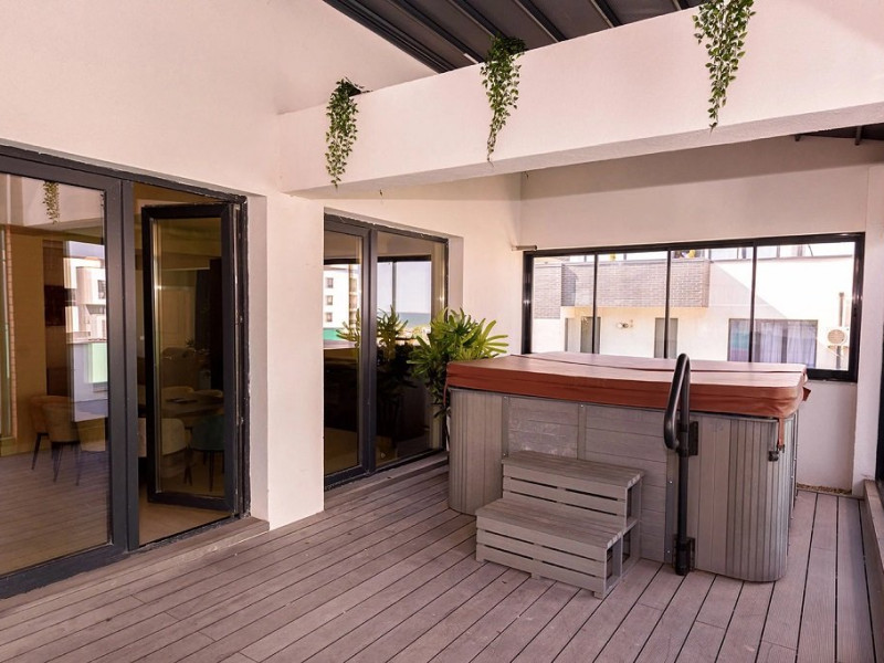 Penthouse-ul este dotat cu LCD tv-uri cu cablu, internet wireless, aer conditionat, bai moderne cu dus, fier si masa de calcat, uscator de rufe, uscator de par, pardoseala de parchet, plasa de tantari, masina de spalat rufe, produse de curatenie (burete de vase, detergent de vase, solutii de igienizare, mop, matura, galeata), bucatarii echipate (plita, hota, cuptor, frigider, espressor, sandwich maker, prajitor de paine, fierbator). Apartamentul 611 - penthouse - este situat la etajele 3 si 4 si dispune de 5 terase mobilate (masa, scaune si jacuzzi). Pe etajul 3 se afla un living cu canapele fixe si loc de servit masa, trei dormitoare matrimoniale (160x200), bucatarie si 3 bai cu dus. Pe etajul 4 exista un living cu masa si scaune pentru jocuri de societate (sah, table, poker, rummy), un dormitor cu canapea extensibila (160x200), bucatarie si baie cu dus. Pe etajul 3, bucataria este dotata si cu cuptor, in bai exista uscator de par, in living este Smart tv cu diagonala de 140 cm, in timp ce in dormitoare exista Smart tv cu diagonala de 108 cm. Pe etajul 3, toate cele 4 camere dispun de aer conditionat, in timp ce la etajul 4, aer conditionat este doar in living. Livingul de la etajul 4 nu are TV, insa dormitorul este dotat cu Smart tv cu diagonala de 119 cm si consola Play station 4. Suprafata 320 mp. Apartamentul se preda cu curatenia facuta, 2 prosoape mari + 2 prosoape mici/pat . Se ofera o alta curatenie si schimb de lenjerii si prosoape pt sejururi mai mari de 7 zile. Apartamentul se predau cu curatenia facuta, 2 prosoape mari + 2 prosoape mici/pat . Se ofera o alta curatenie si schimb de lenjerii si prosoape pt sejururi mai mari de 7 zile.