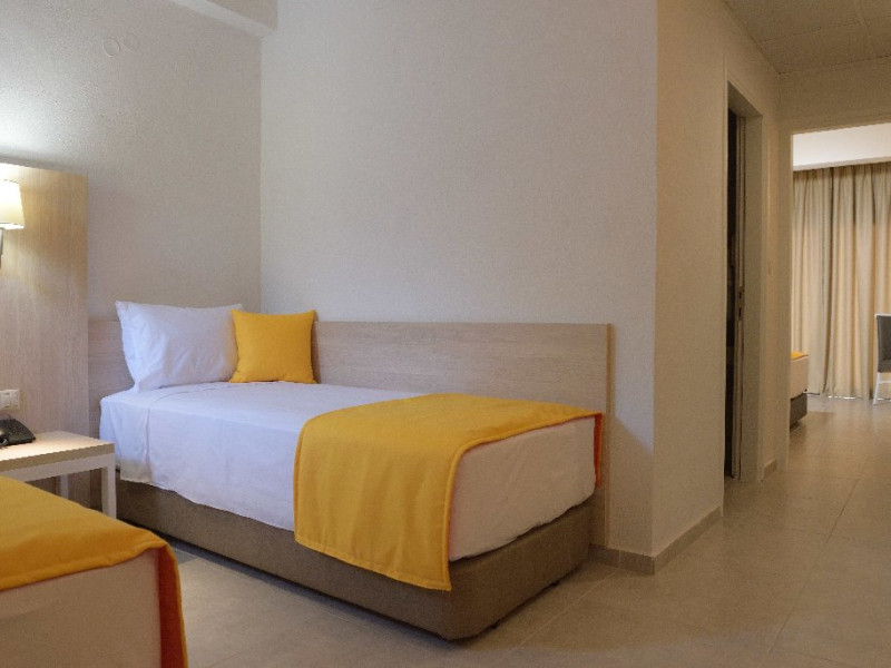 Dubla standard cu vedere la gradina: 17-22 mp, pat matrimonial sau 2 paturi twin. Dubla standard cu vedere la mare: 17-22 mp, pat matrimonial sau 2 paturi twin. Camerele superioare: 35 mp, pat matrimonial si canapea extensibila sau un pat single. Family Apartment: 45-50 mp, 2 dormitoare separate de usa, unul cu pat matrimonial, iar celalalt cu 2 paturi twin. Maisonette: 45-50 mp, cu 2 dormitoare separate pe doua nivele diferite, unul cu pat matrimonial, celalalt cu 2 paturi twin. Facilitati hotel: parcare fara taxa, receptie, lift, tennis de masa (contra cost), billiard (contra cost), volei pe plaja, teren tennis, teren fotbal (mini), spalatorie si calcatorie, camera depozitare bagaje, bar, restaurant, sala conferinte dotata cu echipamente audio - vizuale (capacitate 800 persoane). Umbrele si sezlonguri la piscina si pe plaja sint fara taxa.