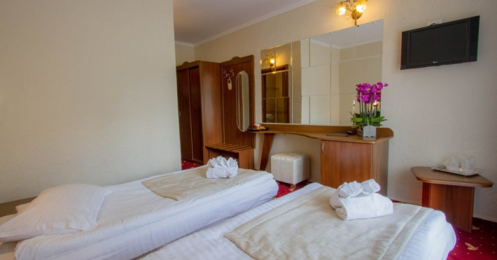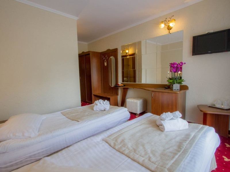 Cabana Schiorilor Predeal enjoys a privileged position in the resort, being located right on the slope Clabucet Arrival . Also it represents a starting point for various hiking trails and tourist attractions . The hotel meets guests with 23 double rooms , of which 8 twin bedded and 13 , and 2 suites . Their facilities are modern , tailored both to the needs of young and older of these include internet, TV , minibar and bathroom. Skiers Chalet restaurant with traditional dishes but wait for the tourists and international cuisine , has a capacity of 80 seats and is inde space for lunch or dinner in a pleasant environment . The hotel has a conference room with a capacity of 40 seats.