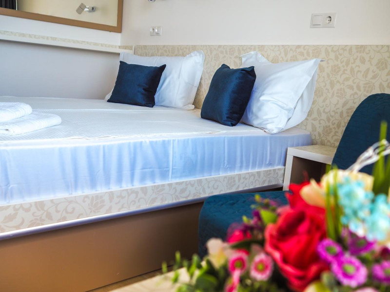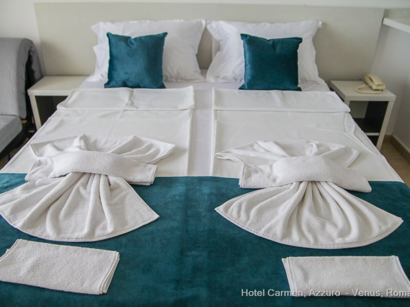 Hotelul Carmen Azzuro se afla in zona centrala a statiunii Venus, pe strada principala, cu acces la plaja si dig. Facilitati hotel: receptie non-stop, sala de conferinte, lift, restaurant, terasa, gradina, loc de joaca pentru copii, jocuri si puzzle-uri, divertisment (muzica live, programe cu animatori pentru copii), piscina, bar, WI-FI gratuit, parcare gratuita, parcare pentru persoanele cu dizabilitati, camera de bagaje, reducere acordata la achizitia sezlongurilor pe plaja Bali, situata la 100 metri de hotel pe plaja mare a statiunii. Facilitati camere: aer conditionat, baie proprie cu dus, uscator de par, TV LCD, frigider, telefon, balcon, plasa de tantari, WI-FI gratuit. Mic dejun= in regim bufet suedez- varietate bogata de preparate calde si reci- apa, bauturi racotitoare, ceai, cafea incluse . Demipensiune = mic dejun+pranz/cina in regim bufet suedez -feluri diversificate din bucataria romaneasca si internationala cu bufet de salate, fructe si deserturi- apa, bauturi racoritoare, vinul casei, bauturi alcoolice(whisky,vodca si gin) si bere la draft oferite doar in timpul orelor de masa in cadrul restaurantului si la barul piscinei. All inclusive light = mic dejun+pranz+cina in regim bufet suedez-feluri diversificate din bucataria romaneasca si internationala cu bufet de salate, fructe si deserturi-apa si bauturi racoritoare pe tot parcursul zilei (7:30-22:00), vinul casei, bauturi alcoolice(whisky,vodca si gin) si bere draft in intervalul 11:00-22:00 in cadrul restaurantului si la barul piscinei.