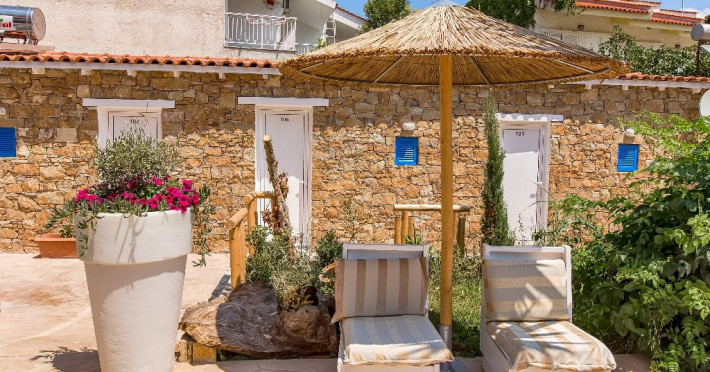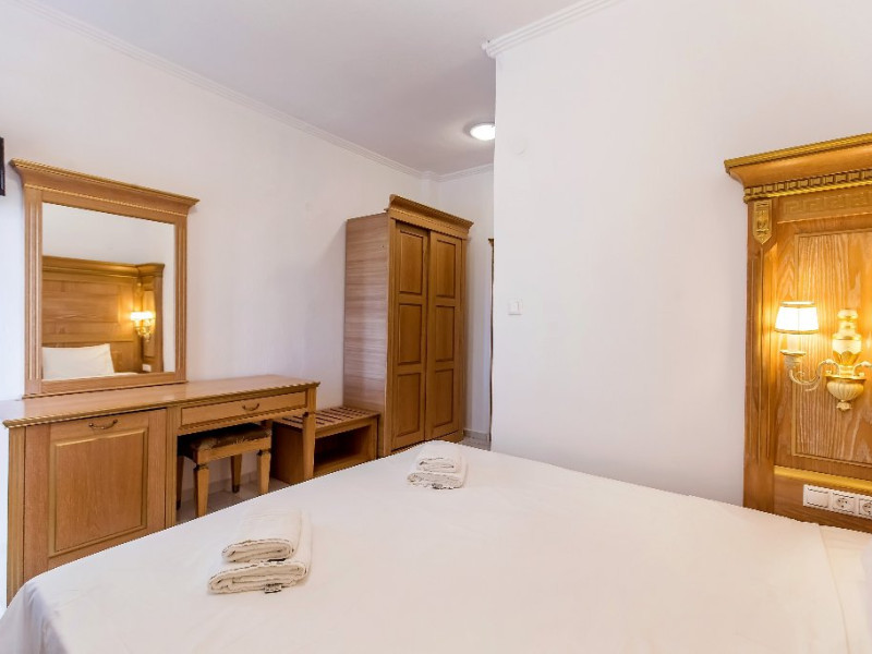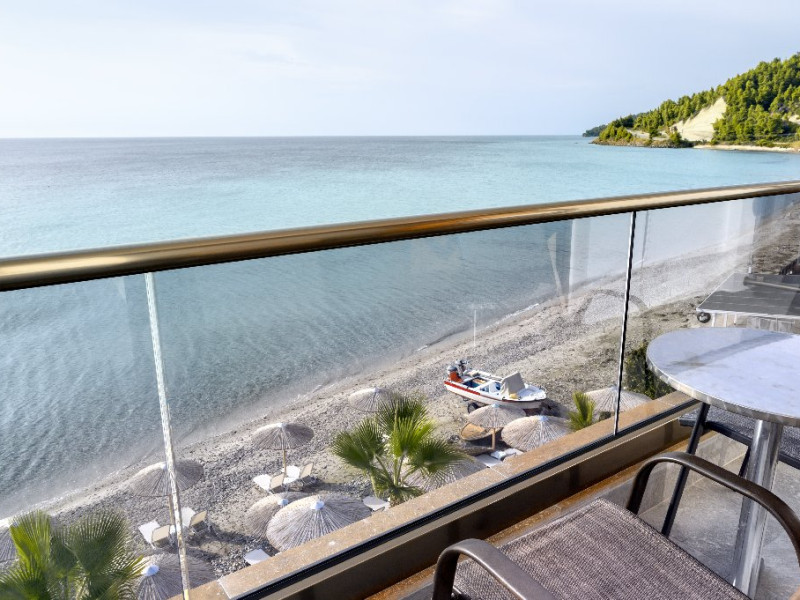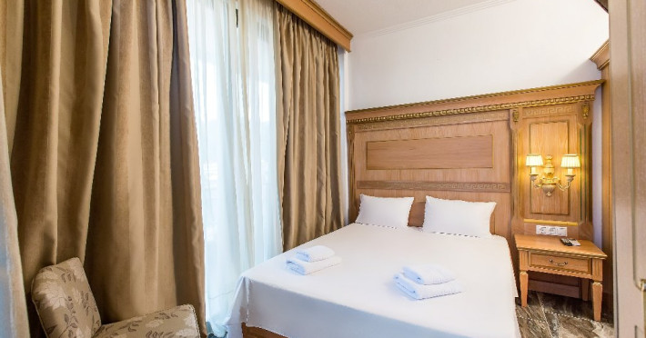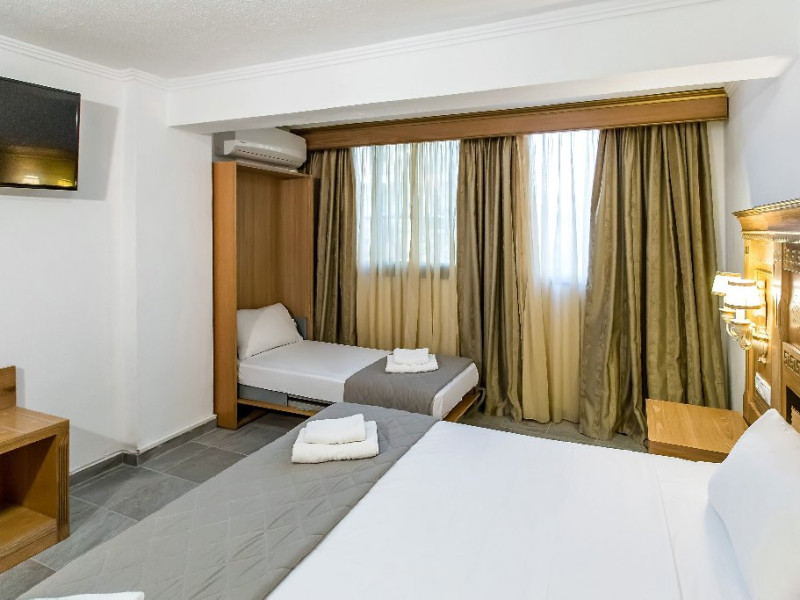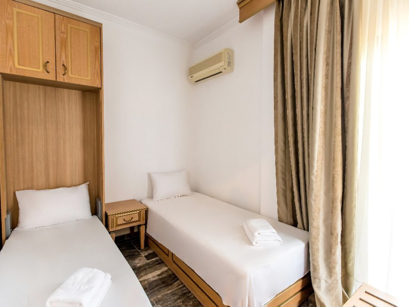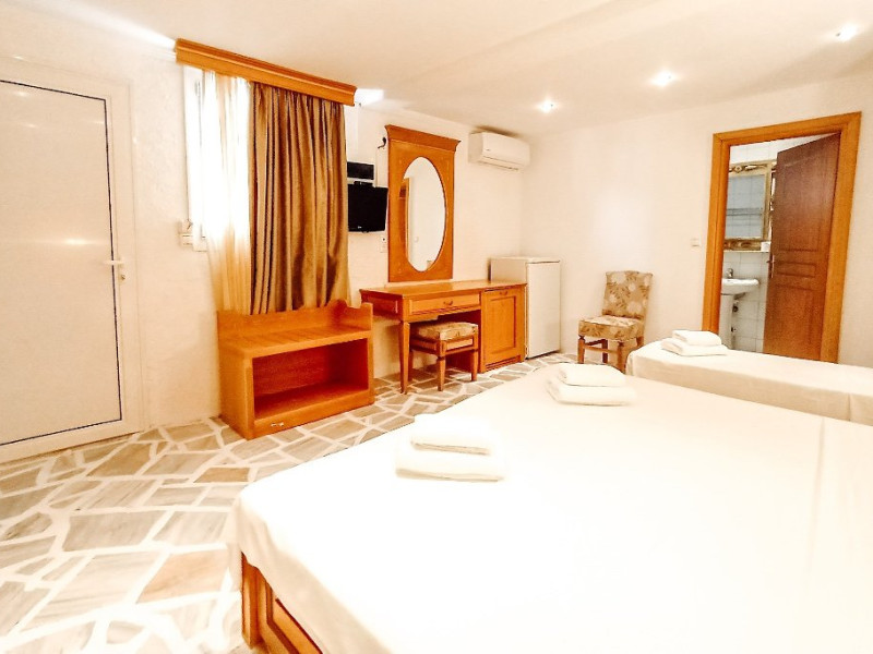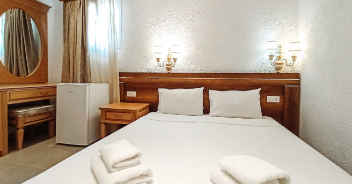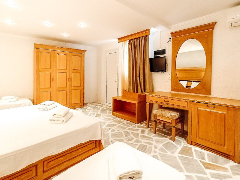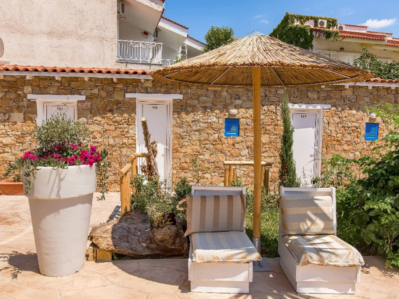 Dubla cu vedere laterala la mare: 18 mp, max 2 adulti + 1 copil Tripla economy: 25 mp, max 2 adulti + 1 copil, localizate la parter, cu vedere la strada, fara balcon Dubla bungalow: 18 mp, max 2 persoane Tripla bungalow: 18 mp, max 2 adulti + 1 copil Apartament family cu vedere la gradina: 40 mp, max 4 adulti, 2 adulti + 2 copii, 3 adulti + 1 copil Suita family: 46 mp, max. 4 adulti + 2 copii Distanta fata de plaja: 0 m Distanta fata de centru Paralia Fourkas: 700 m Distanta fata de aeroportul Salonic: 93 km
