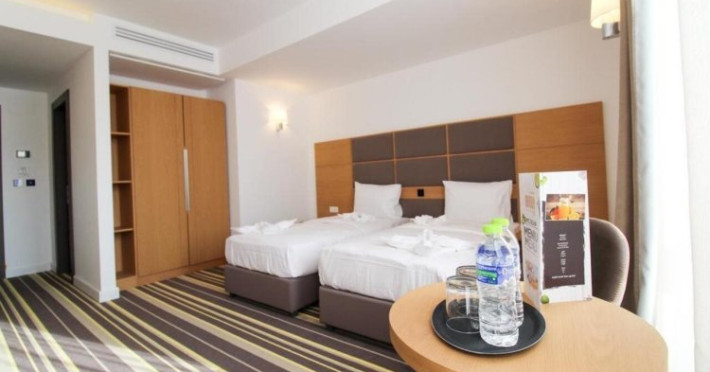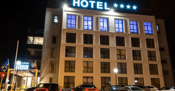 Hotel Avenue 4* este localizat ultracentral in Buzau, dispune de 66 de camere dotate la standarde de 4 stele, avand urmatoarea structura:13 duble standard /12 twin standard /22 duble deluxe/ 19 twin deluxe. Facilitati camere: seif, uscator de par, cosmetice premium, papuci, televizoare LCD, halate, telefon, acces cu cartela, dus, apa plata, kettle, wake-up call, minibar, WiFi, AC,. Restaurant UVA are 100 locuri si bucatarie cu specific italian. De asemenea, hotelul beneficiaza si de un lobby bar cu program non stop. Extra servicii: parcare, spa, fitness. Lavo Ballroom este situat la ultimul etaj la hotelului, are terasa proprie pentru fumatori , acces direct cu cele 2 lifturi si poate gazdui orice tip de eveniment: evenimente corporate, de pana la 400 persoane, nunti, botezuri sau alte tipuri de evenimente de pana la 300 de persoane.