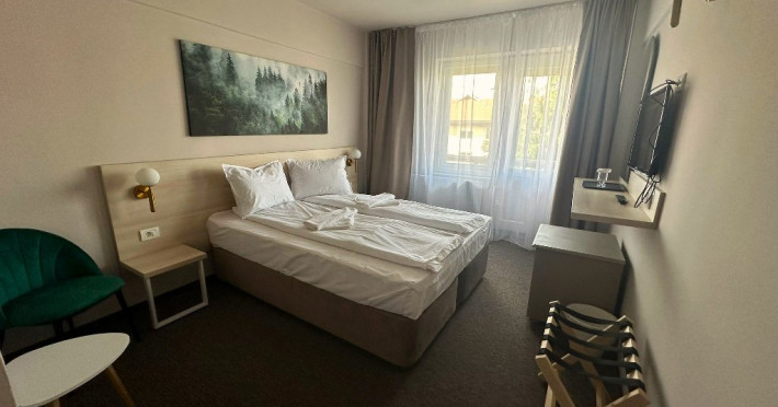 DESCRIERE CAMERE:Camera standard - 5 camere matrimoniale 55 camere twin, pot acomoda max. 2 adulti si 1 copil pana la 14 ani. Camera Standard ofera un spatiu confortabil si primitor, perfect pentru o sedere relaxanta. Aceasta camera dispune de un pat matrimonial generos sau doua paturi twin, balcon, wi-fi, telefon, baie cu cabina de dus, papuci si halat, minifrigider, tv.