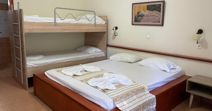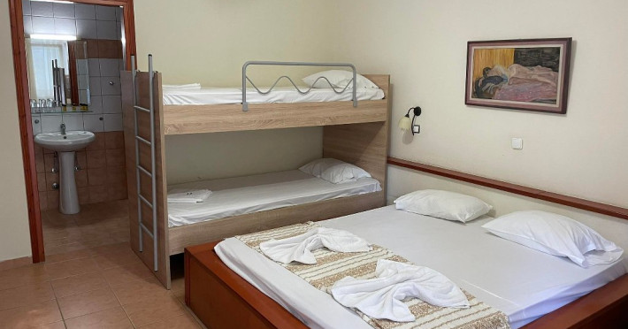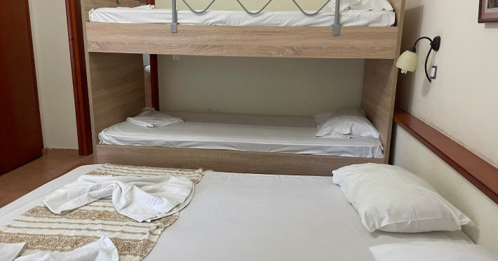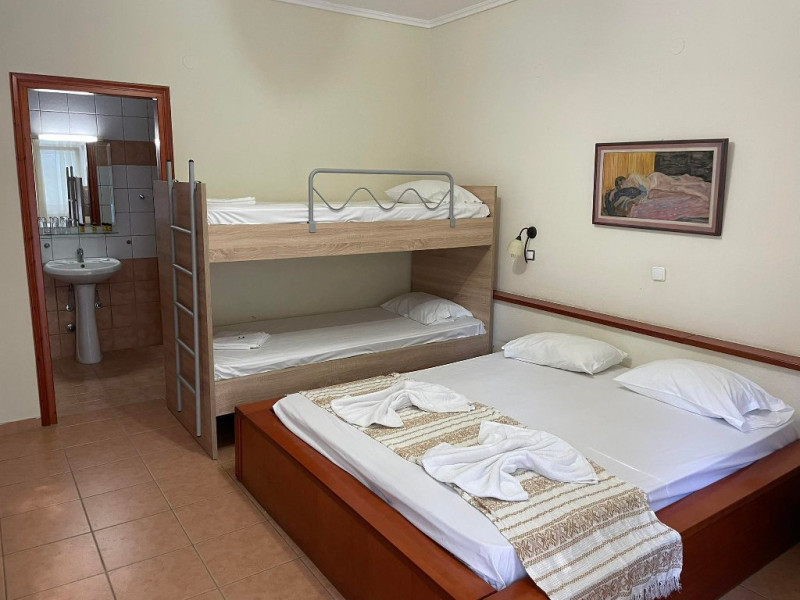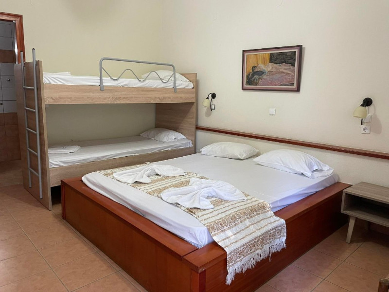 Facilitati camere: Cele 22 de camere sunt dotate cu: AC, TV, WiFi, seif, frigider, feon, baie cu dus/cada si balcon/veranda. Lenjeria si prosoapele se schimba la 3 zile. 13 X camere duble (19 m2) 2 X camere duble cu pat supraetajat (23 m2) 5 X camere triple (30 m2) 2 X camere family (38 m2)