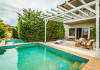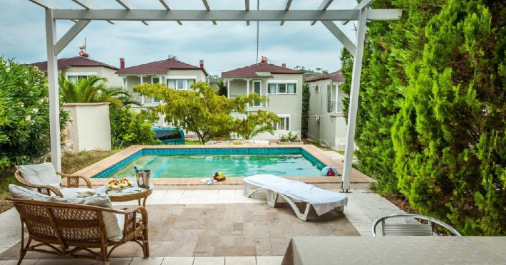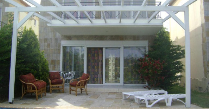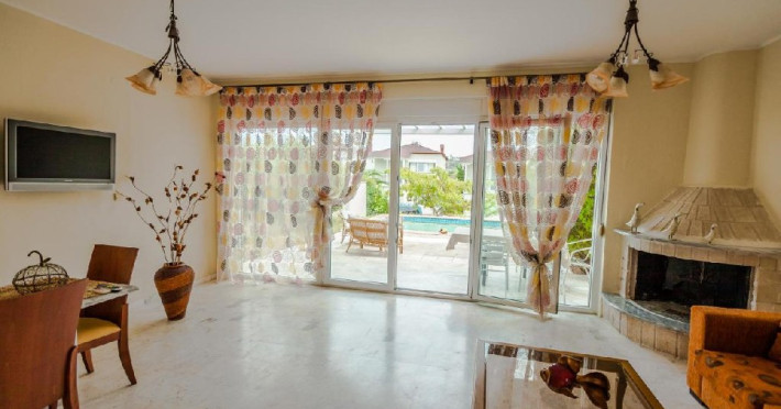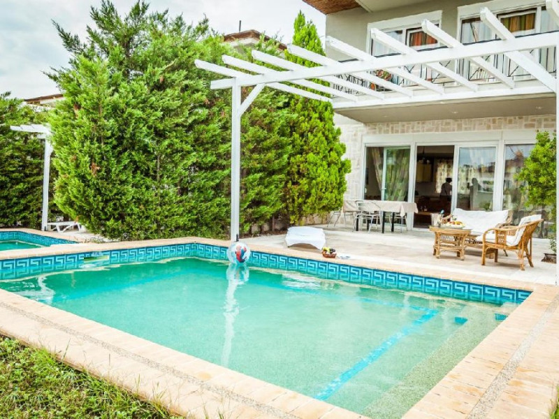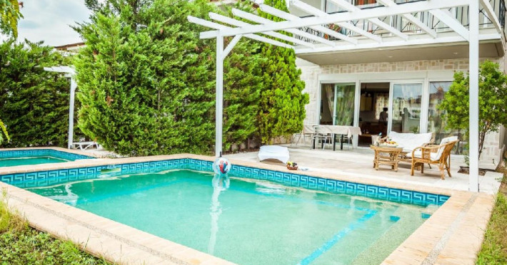 Fiecare vila are 3 etaje si benefiaza de piscina privata. Subsol folosit ca sala sport. Parter: bucatarie complet utilata, living cu semineu, toaleta cu dus. Etaj: 3 dormitore si baie cu cada si masina de spalat.