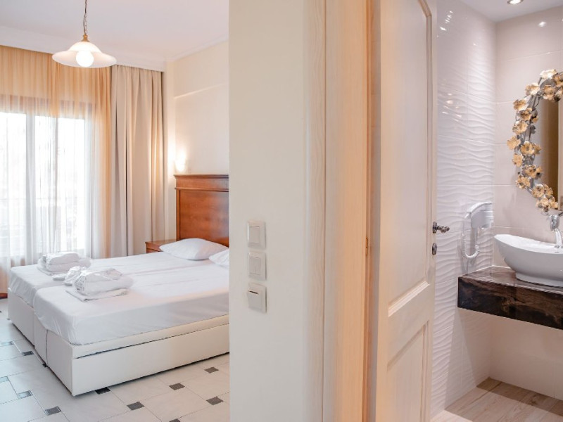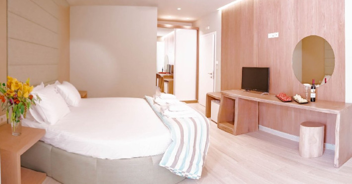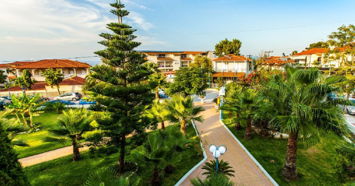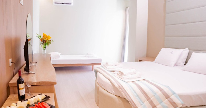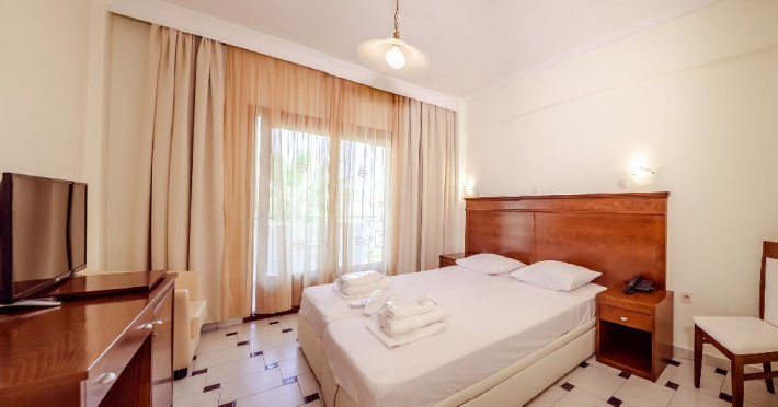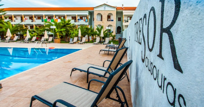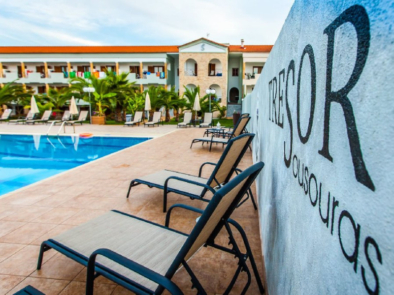 Locatie: Tresor Sousouras Hotel se afla in centrul statiunii Hanioti, la 100 metri de plaja si aproximativ 200 de metri de centrul statiunii, magazine, taverne , cafenele si super-market. Plaja Pefkohori la 4.5 km. Facilitati camere: 41 de camere, situate in 2 cladiri invecinate si sunt dotate cu: TV, aer conditionat, internet Wi-Fi, uscator de par, frigider, seif (contra cost), papuci de baie, baie cu dus sau cada, balcon sau veranda.