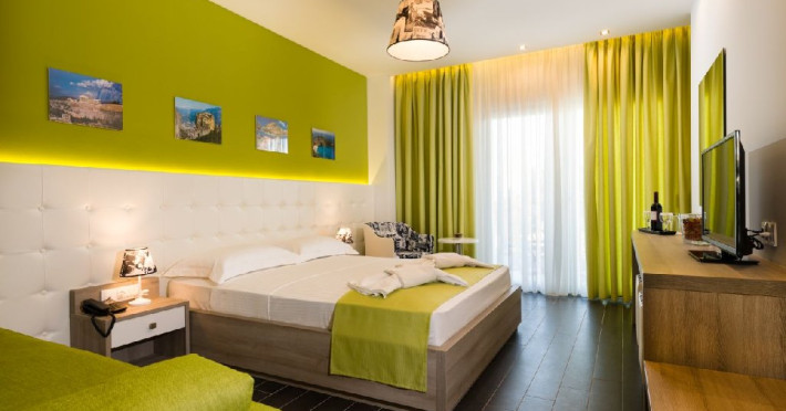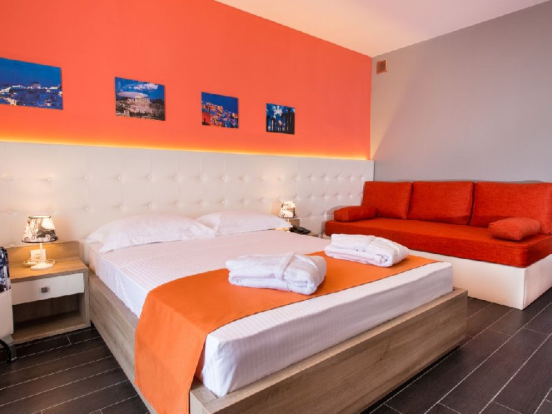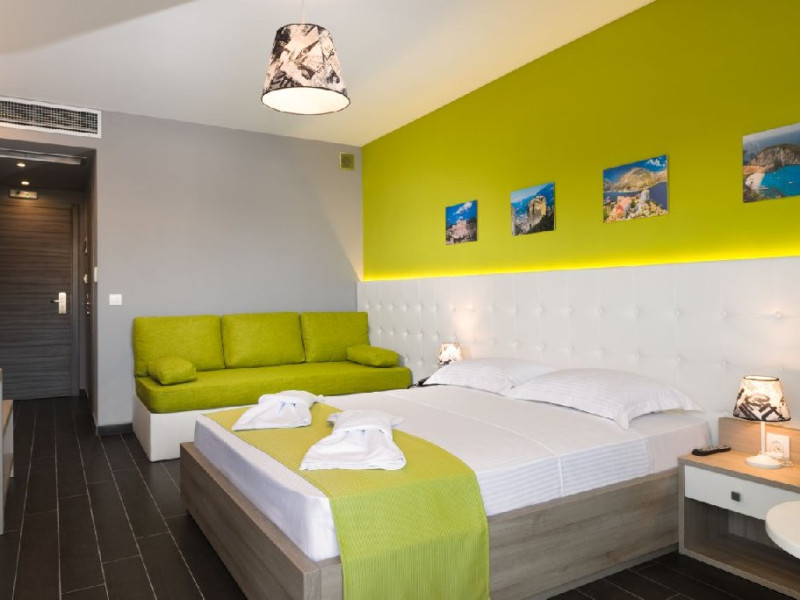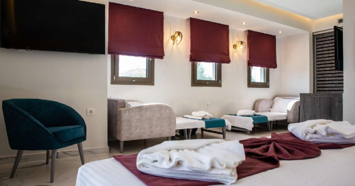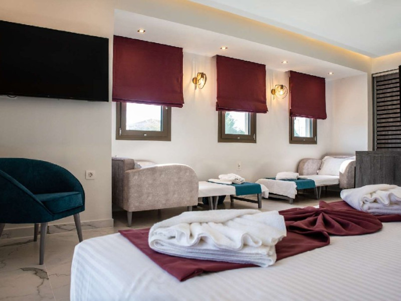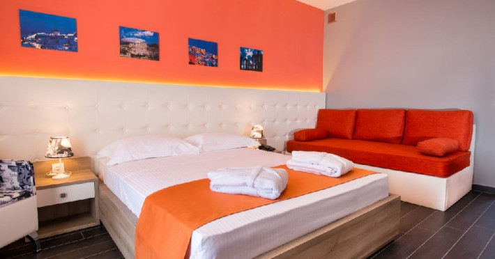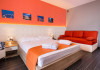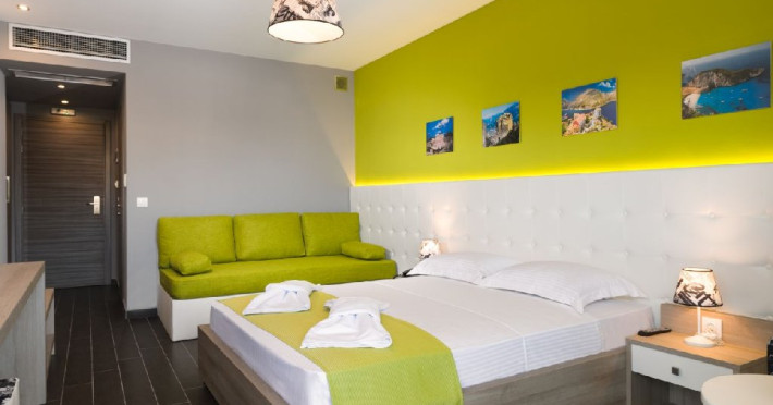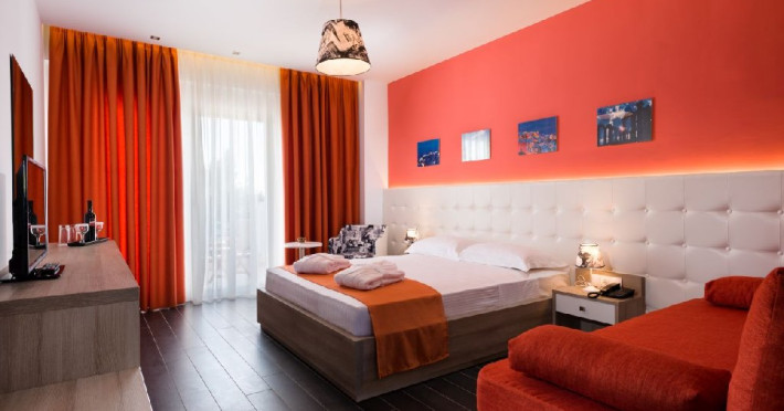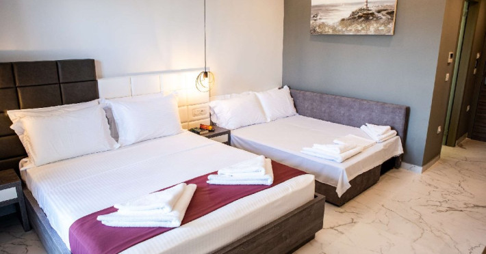 Camera quadrupla (26 - 31 m2): pat matrimonial si canapea extensibila.Deluxe Cvadrupla (26 - 29 mp): decorata in linii elegante si baie luxoasa; Camera are un pat dublu cu saltea dubla si o canapea extensibila (potrivita pentru 4 adulti).