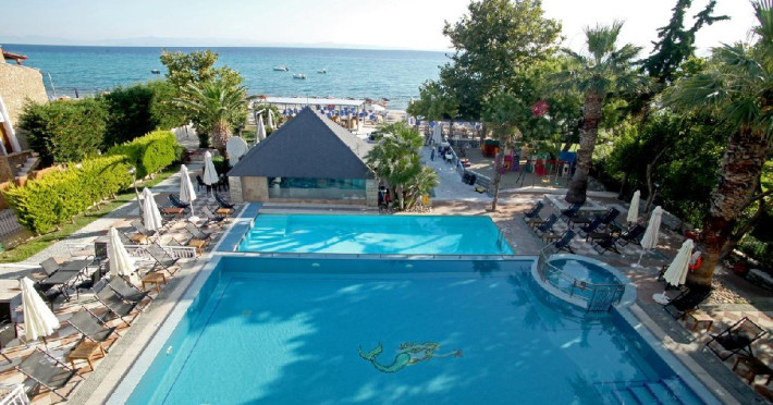 Locatie: Hotelul Naias este unul dintre cele mai cautate hoteluri din Halkidiki, datorita servicilor ireprosabile. Hotelul este construit pe plaja din Hanioti, la doar 200 m distanta de zona de centru.