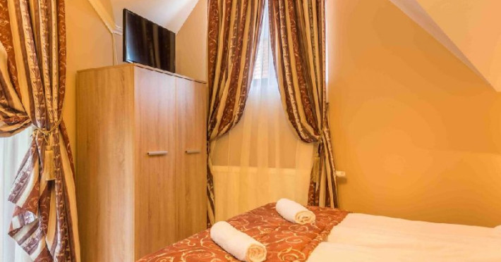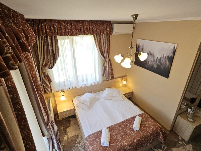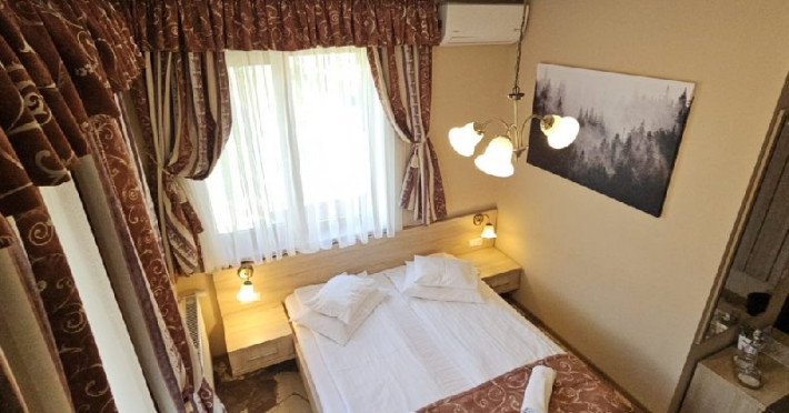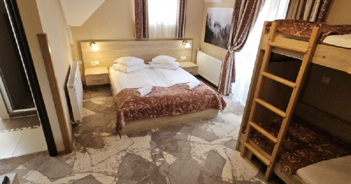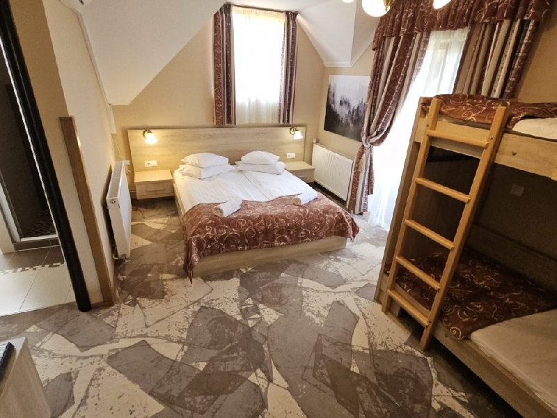 DESCRIERE CAMERE: Pensiunea dispune de 46 locuri de cazare, impartite in 6 camere duble cu pat matrimonial, 2 apartamente si 7 camere familiale, cu pat matrimonial si 2 paturi supraetajate. Camerele sunt dotate cu baie proprie complet echipata, cu TV LCD, cu internet Wireless gratuit, aer condirtionat, unele au terase, saltele comode Memory Foam, posibilitati ideale pentru relaxare si odihna. Living-ul pensiunii este spatios, cu panorama, modern mobilat, televizor cu ecran mare LCD Smart, incalzire in pardoseala, iluminat cu efecte de lumini.