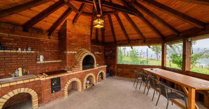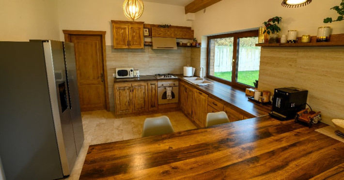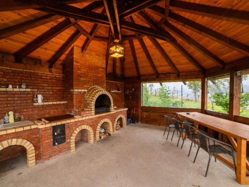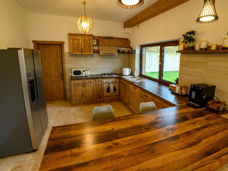 DESCRIERE UNITATE DE CAZARE Capacitatea de cazare este de 10 adulti si 2 copii, in 5 camere cu baie proprie. Oaspetii au la dispozitie o bucatarie moderna utilata cu cuptor, cuptor cu microunde, expresor de cafea, prajitor de paine, masina de spalat vase; loc de luat masa, living cu 2 canapele spatioase, fotolii si semineu.