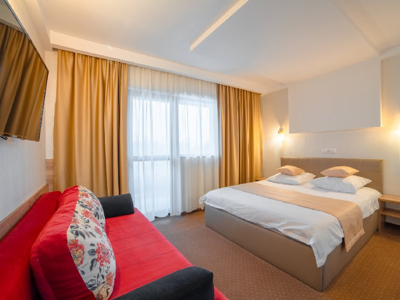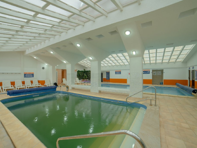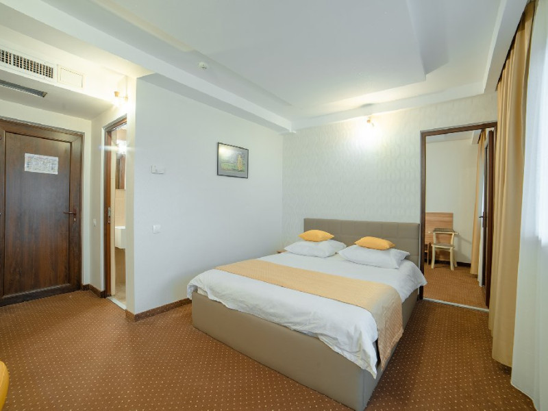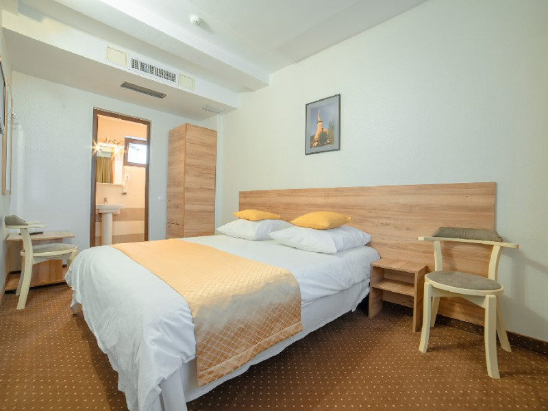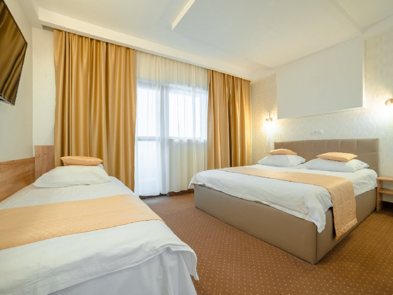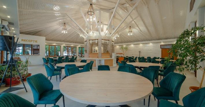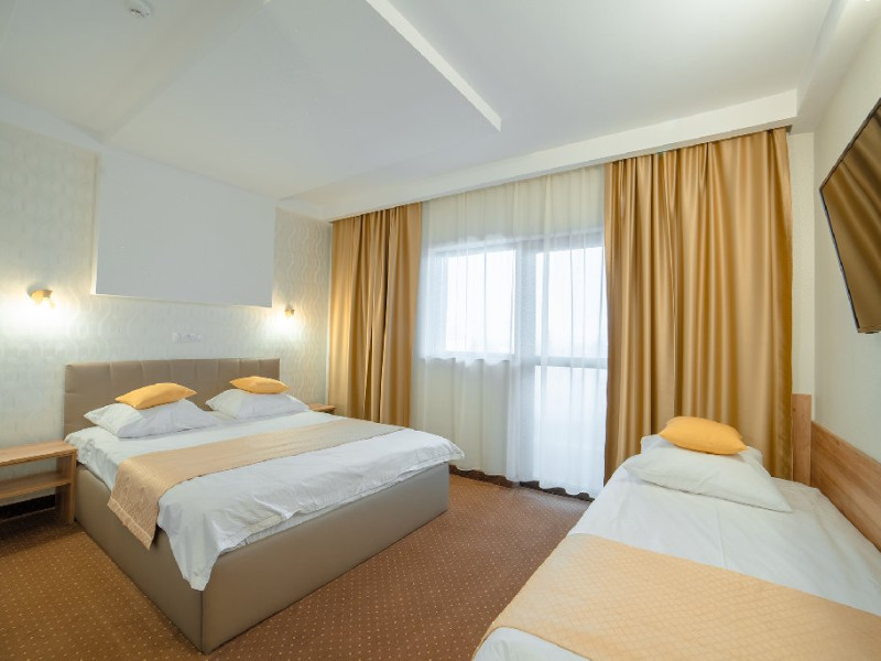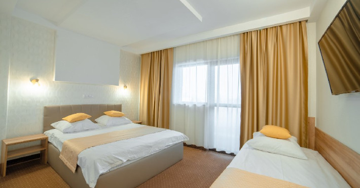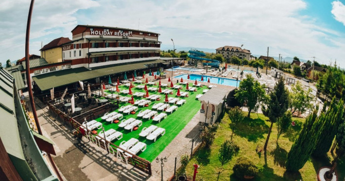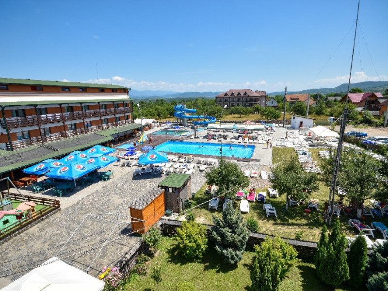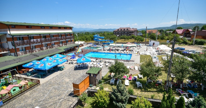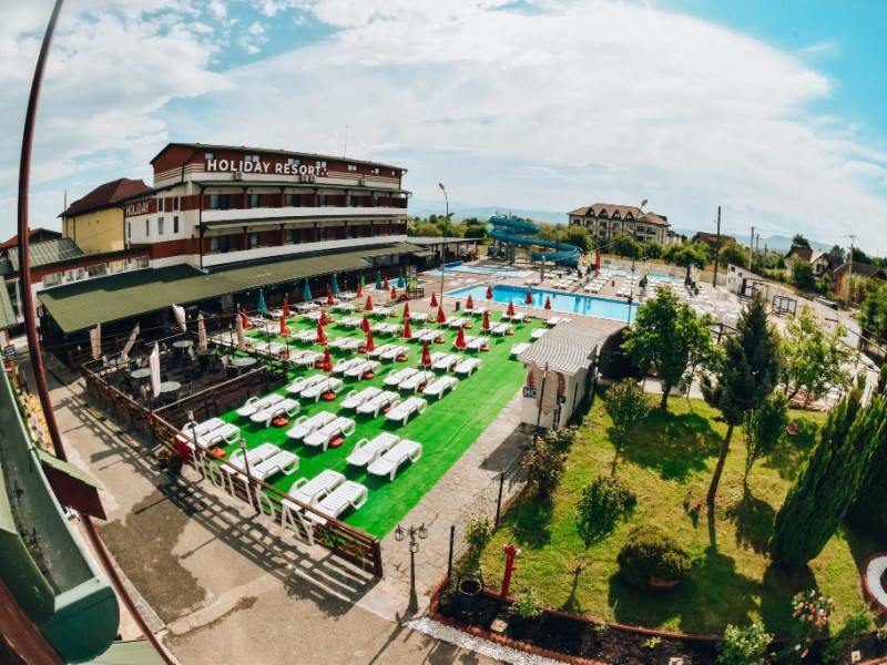 INFORMATII GENERALE Pensiunea Holiday este amplasata in statiunea balneoclimatica Ocna Sugatag, in inima Maramuresului istoric la 18 km de Sighetu Marmatiei si la 6 km de DN18. DESCRIERE UNITATE DE CAZARE Povestea pensiunii a inceput in 2005, cand au fost deschise portile turistilor, iar printre investitiile recente din 2021 se numara renovarea camerelor, adaugarea unui jacuzzi interior si modernizarea completa a restaurantului. FACILITATI UNITATE Pensiunea Holiday are la ora actuala statutul unui RESORT, deoarece cuprinde doua capacitati de cazare clasificate la 3 stele, un restaurant traditional si clasic clasificat la 3 stele, salon pentru servit micul dejun, sala de conferinta. In exterior pensiunea dispune de piscina cu apa dulce, piscina cu apa sarata si un aquapark. In interior se mai afla sauna, camera salina, piscina interioara cu apa dulce si cu apa sarata. DESCRIERE CAMERE Cele doua corpuri de cazare dispun de locuri de cazare amplasate in camere duble si apartamente. Camere duble dispun de pat matrimonial sau 2 paturi twin. Apartamentele sunt formate din doua camere nedecomandate. In una din camere se afla un pat matrimonial, iar in cealalta se afla 2 paturi twin sau un pat matrimonial. Unul dintre apartamente dispune de o singura baie, iar cel de-al doilea apartament dispune de 2 bai. Toate camerele sunt clasificate la 3 stele, avand baie proprie, tv, wifi. Incalzirea este centralizata si se realizeaza cu ventiloconvectoare sau calorifere. LOCALIZARE Pensiunea Holiday este amplasata in statiunea balneoclimatica Ocna Sugatag, in inima Maramuresului istoric la 18 km de Sighetu Marmatiei si la 6 km de DN18. ATRACTII TURISTICE Baile si piscinele cu apa sarata, Manastirea Barsana(9 km), Memorialul Victimelor Comunismului i al Rezistenei de la Sighet (20 km). POLITICI Nu sunt permise animalele de companie. SERVICII MASA Mesele se asigura in restaurantul propriu. FACILITATI COPII Piscine exterioare, aquapark. FACILITATI EVENIMENTE Sala de conferinte este spatioasa si modern echipata, oferind un mediu profesional ideal pentru intalniri de afaceri, seminarii sau evenimente corporate. Cu dotari precum proiector si conexiune Wi-Fi de mare viteza, sala poate acomoda pana la 40 persoane.