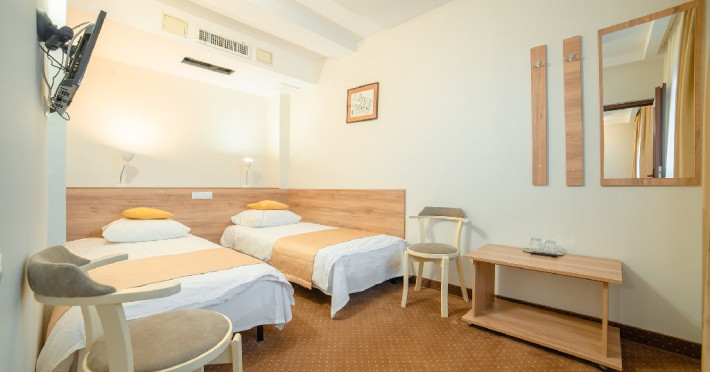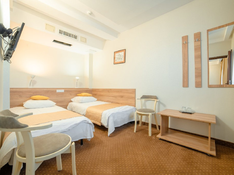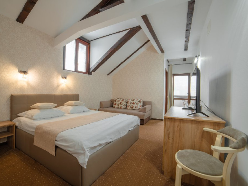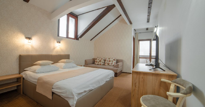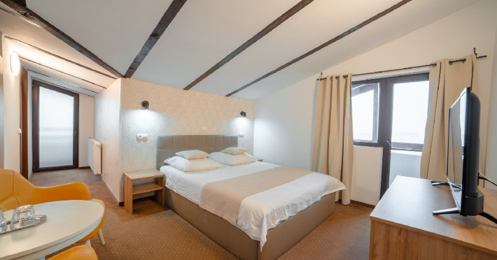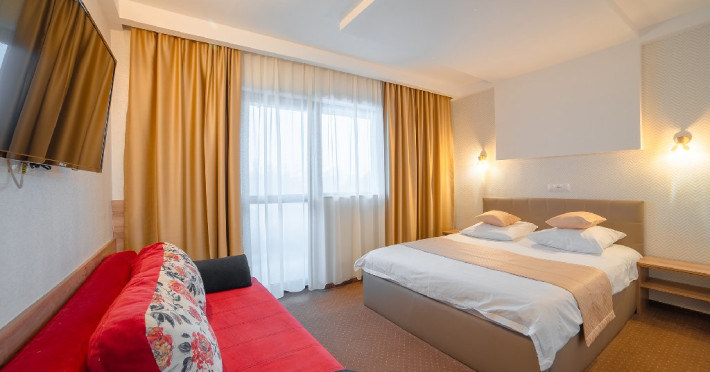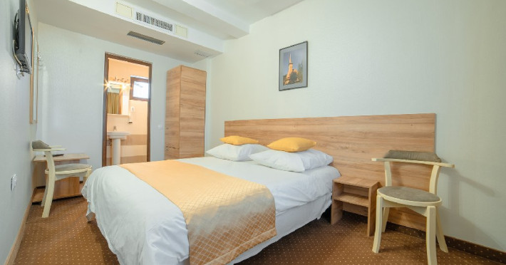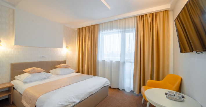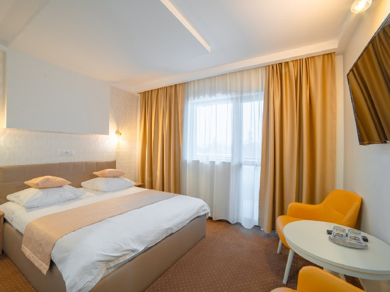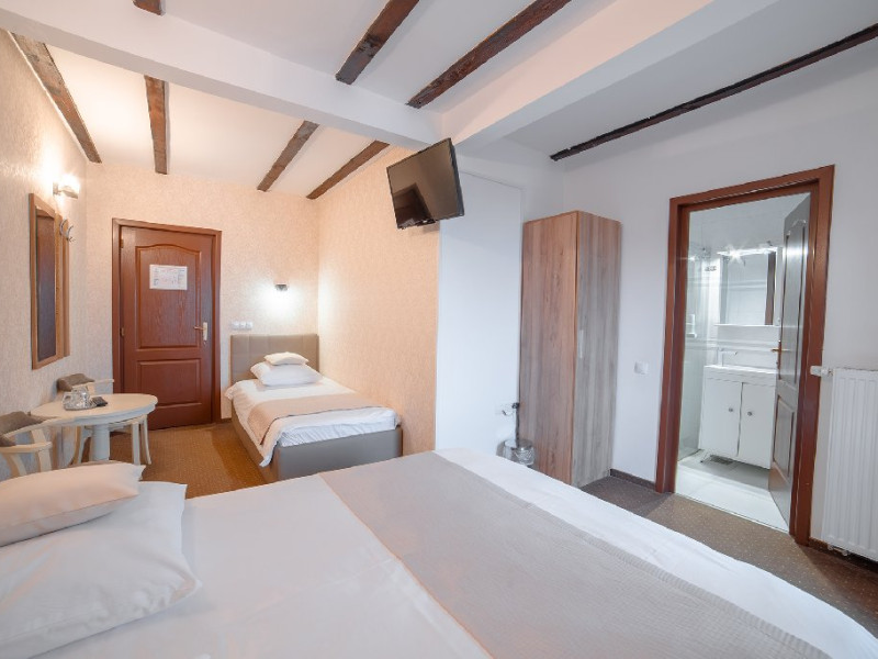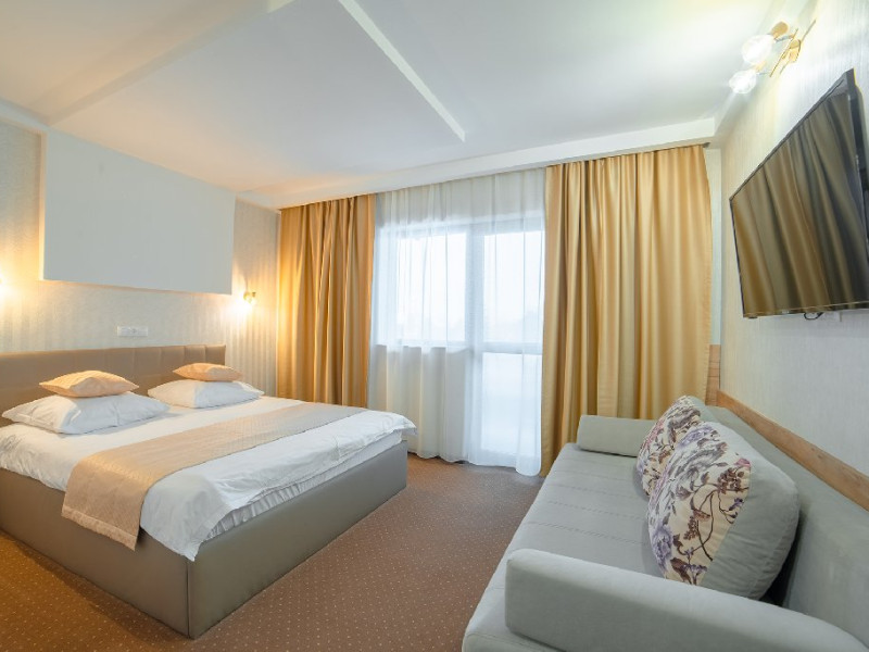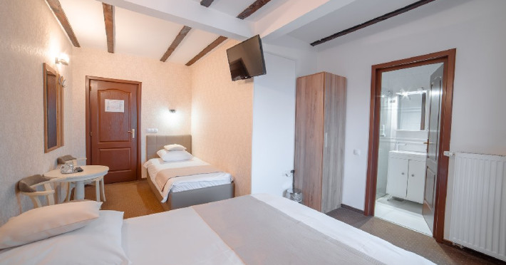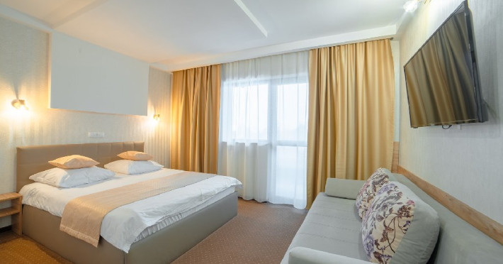 INFORMATII GENERALE Pensiunea Holiday este amplasata in statiunea balneoclimatica Ocna Sugatag, in inima Maramuresului istoric la 18 km de Sighetu Marmatiei si la 6 km de DN18. DESCRIERE UNITATE DE CAZARE Povestea pensiunii a inceput in 2005, cand au fost deschise portile turistilor, iar printre investitiile recente din 2021 se numara renovarea camerelor, adaugarea unui jacuzzi interior si modernizarea completa a restaurantului. FACILITATI UNITATE Pensiunea Holiday are la ora actuala statutul unui RESORT, deoarece cuprinde doua capacitati de cazare clasificate la 3 stele, un restaurant traditional si clasic clasificat la 3 stele, salon pentru servit micul dejun, sala de conferinta. In exterior pensiunea dispune de piscina cu apa dulce, piscina cu apa sarata si un aquapark. In interior se mai afla sauna, camera salina, piscina interioara cu apa dulce si cu apa sarata. DESCRIERE CAMERE Cele doua corpuri de cazare dispun de locuri de cazare amplasate in camere duble si apartamente. Camere duble dispun de pat matrimonial sau 2 paturi twin. Apartamentele sunt formate din doua camere nedecomandate. In una din camere se afla un pat matrimonial, iar in cealalta se afla 2 paturi twin sau un pat matrimonial. Unul dintre apartamente dispune de o singura baie, iar cel de-al doilea apartament dispune de 2 bai. Toate camerele sunt clasificate la 3 stele, avand baie proprie, tv, wifi. Incalzirea este centralizata si se realizeaza cu ventiloconvectoare sau calorifere. LOCALIZARE Pensiunea Holiday este amplasata in statiunea balneoclimatica Ocna Sugatag, in inima Maramuresului istoric la 18 km de Sighetu Marmatiei si la 6 km de DN18. ATRACTII TURISTICE Baile si piscinele cu apa sarata, Manastirea Barsana(9 km), Memorialul Victimelor Comunismului i al Rezistenei de la Sighet (20 km). POLITICI Nu sunt permise animalele de companie. SERVICII MASA Mesele se asigura in restaurantul propriu. FACILITATI COPII Piscine exterioare, aquapark. FACILITATI EVENIMENTE Sala de conferinte este spatioasa si modern echipata, oferind un mediu profesional ideal pentru intalniri de afaceri, seminarii sau evenimente corporate. Cu dotari precum proiector si conexiune Wi-Fi de mare viteza, sala poate acomoda pana la 40 persoane.