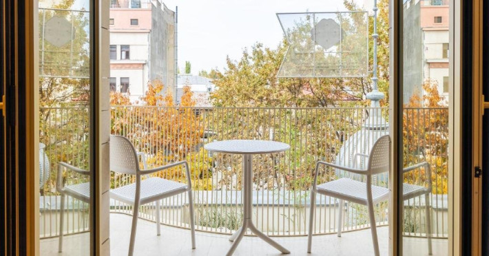 STUDIO cu balcon - Fiecare studio are incalzire prin pardoseala, mobilier la comanda si o baie de calitate superioara cu halate de baie si toate facilitatile necesare. Exista un pat king-size, un dulap luminat, ustensile de bucatarie marca Rosetti, Smart TV cu servicii de streaming de top si o zona versatila de relaxare unde puteti lua masa sau lucra confortabil.