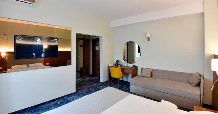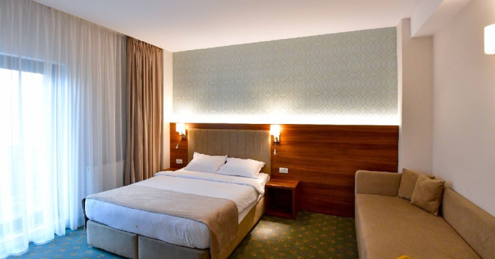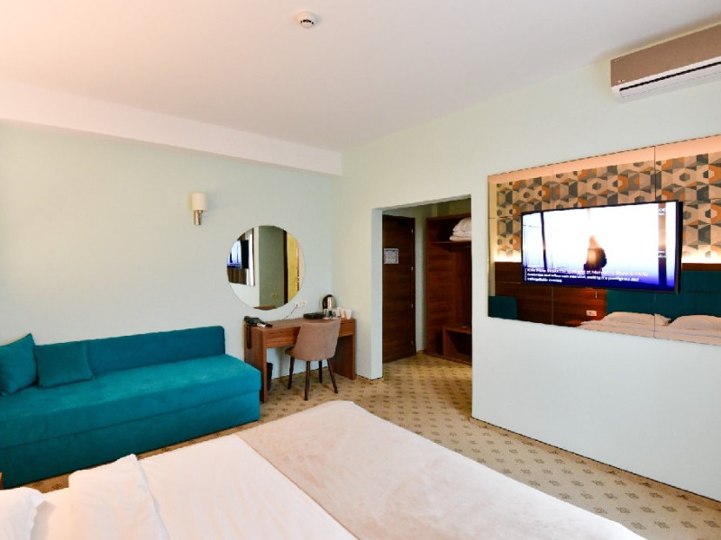 Camera dubla, cu o suprafata de 20 mp, detine un pat dublu extra-large, balcon cu vedere la curtea interioara, baie cu dus, articole de toaleta, TV, AC, internet, minibar, seif, uscator de par. Poate acomoda 2 adulti sau 2 adulti +1 copil ( 0-11.99 ani) Camera tripla, cu o suprafata de 25 mp, detine un pat extra-large si canapea fixa de o persoana, balcon cu vedere la curtea interioara, baie cu dus, articole de toaleta, TV, AC, internet, minibar, seif, uscator de par. Poate acomoda 2 adulti + 2 copii ( primul copil cu varsta de 0-11.99 ani, iar al doilea copil de orice varsta) sau 3 adulti + 1 copil ( 0-11.99 ani).