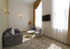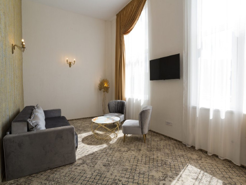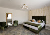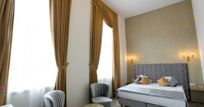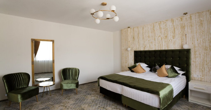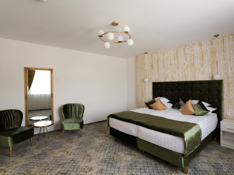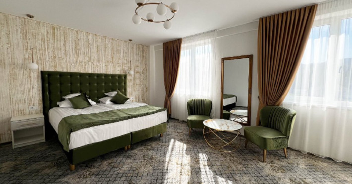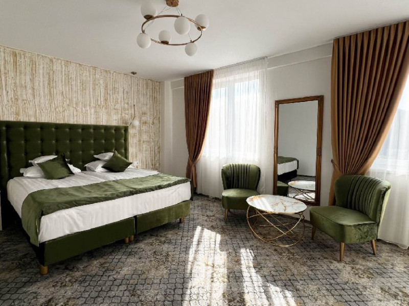 Hotelul Sentir**** este amplasat la intrarea in zona de agrement Parc Arinis, partia de schi, tiroliana, fantana muzicala, piscina acoperita si strand. Este pozitionat la km 0 al zonei turistice din orasul-statiune Gura Humorului. Camerele sunt dispuse pe 4 etaje, toate avand vedere spre munte, cu urmatoarea configurare: - 4 apartamente (cate 1 pe fiecare nivel), cu o suprafata de 45 mp fiecare, cu balcon si vedere spre partie, pot fi acomodate 4 persoane - 2 camere family, cu o suprafata de 37 mp, pot fi acomodati 2 adulti si 2 sau 3 copii - 32 camere duble, cu pat king size, cu o suprafata de 30 mp, toate putand fi transformate la cerere, in twin, pot fi acomodati 2 adulti. La cerere se poate adauga un pat suplimentar pentru copii. Toate camerele sunt spatioase, luminate si detin urmatoarele dotari: acces cu cartela , mocheta, incalzire si racire /climatizare cu pompa, paturi super king 180 cm x 200 cm, dulap haine, cuier, birou, minibar, seif, fotolii si masuta, baie spatioasa in camera (dus,wc,bideu), uscator par, casca de dus, produse de igiena, prosoape, lenjerie bumbac, halate si papuci hotelieri, sistem SOS in bai, sistem detectie fum, wifi gratuit, smart TV cu diagonala mare, telefon, fierbator, buretei papuci, logie cu fotoliu tip balansoar, trusa ac si ata.