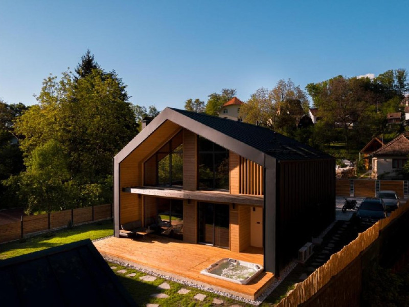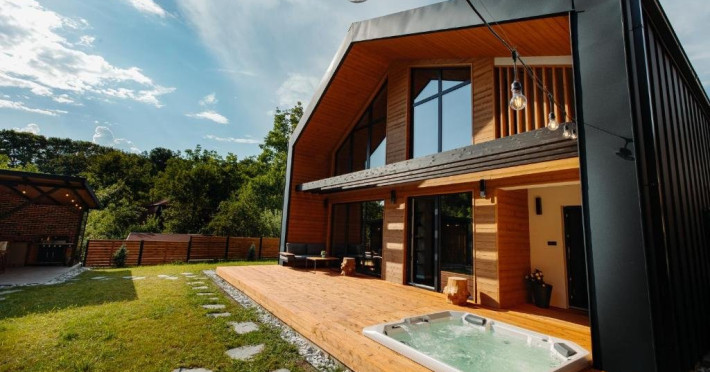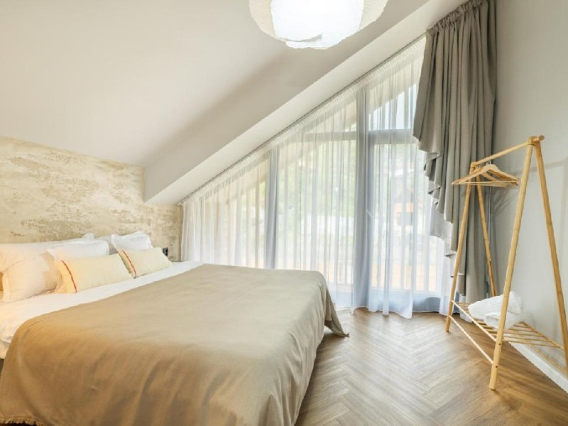 True Cabin este dotata cu zona de living si dining, 4 dormitoare cu bai proprii - 6 grupuri sanitare in total, jacuzzi cu hidromasaj, sauna, zona exterioara de BBQ, gradina cu o terasa si acces gratuit la internet. Locatia dispune si de parcare privata pentru 4 masini. Locatia se vinde integral.