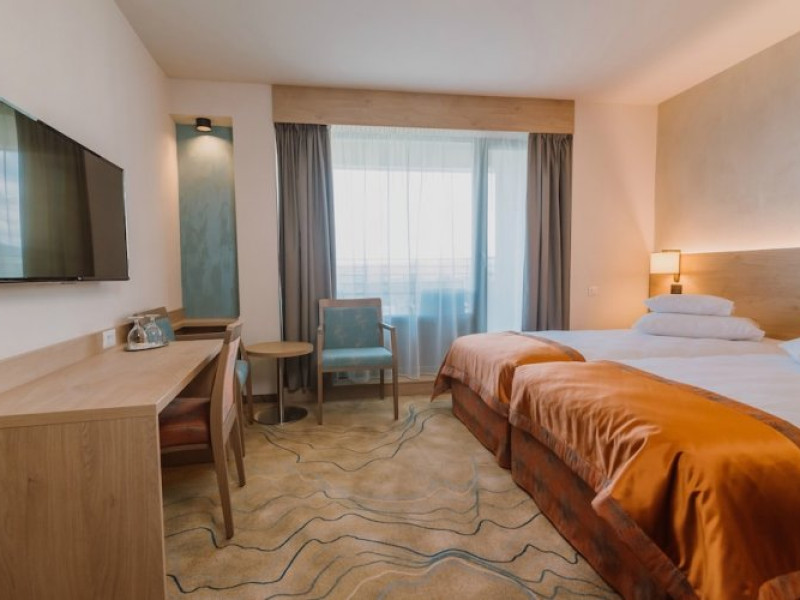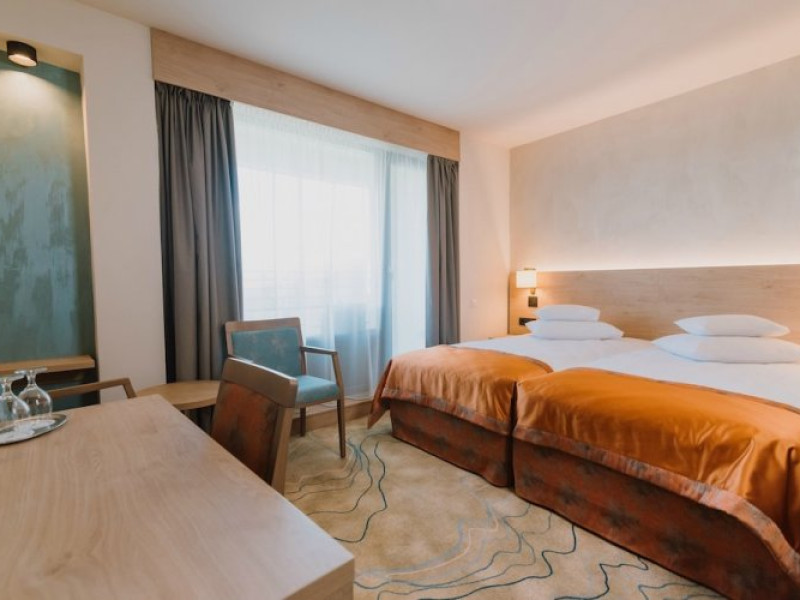 Hotelul Ursina Ensana Health Spa ofera o experienta de cazare deosebita, avand la dispozitie 144 de camere, atat standard cat si superioare, fiecare cu vedere la statiune sau la padure. Fiecare camera este dotata cu balcon, LED TV, Wi-Fi si aer conditionat central, asigurand confortul necesar pentru o vacanta relaxanta. Baile sunt echipate cu cada sau dus, oferind oaspetilor toate facilitatile necesare pentru un sejur placut. Printre facilitatile hotelului se numara un restaurant si un cafe-bar, unde oaspetii pot savura preparate delicioase si bauturi racoritoare. De asemenea, hotelul dispune de un centru SPA complet, care include doua piscine, saune, receptie spa si cabinete medicale si de wellness. Aceste facilitati sunt ideale pentru cei care doresc sa se relaxeze si sa se revigoreze in timpul sejurului lor. In apropierea hotelului, turistii pot explora Lacul Ursu, cunoscut pentru apele sale terapeutice si peisajele pitoresti. De asemenea, zona ofera numeroase trasee de drumetie si oportunitati de recreere in natura, fiind un loc perfect pentru iubitorii de aer liber. Hotelul Ursina Ensana se mandreste cu o oferta variata de mese, asigurand oaspetilor o experienta culinara de neuitat. Restaurantul hotelului ofera preparate din bucataria traditionala si internationala, pregatite cu ingrediente proaspete si de calitate, astfel incat fiecare masa sa fie o placere.