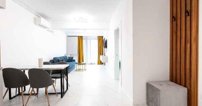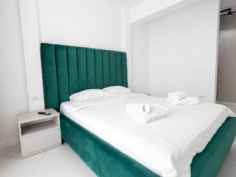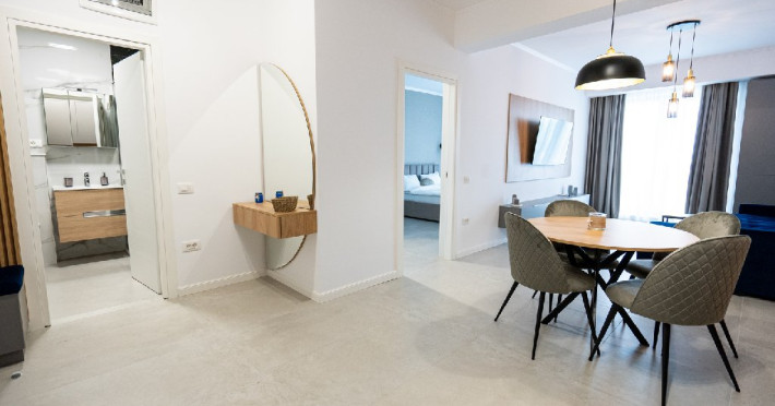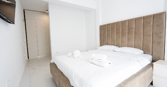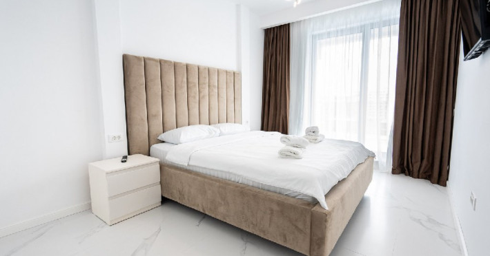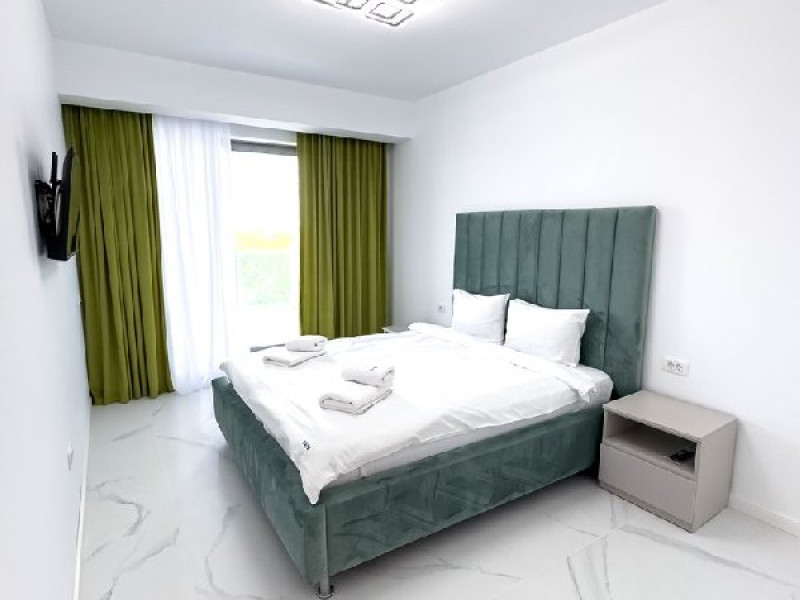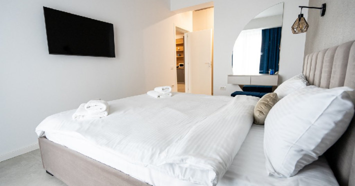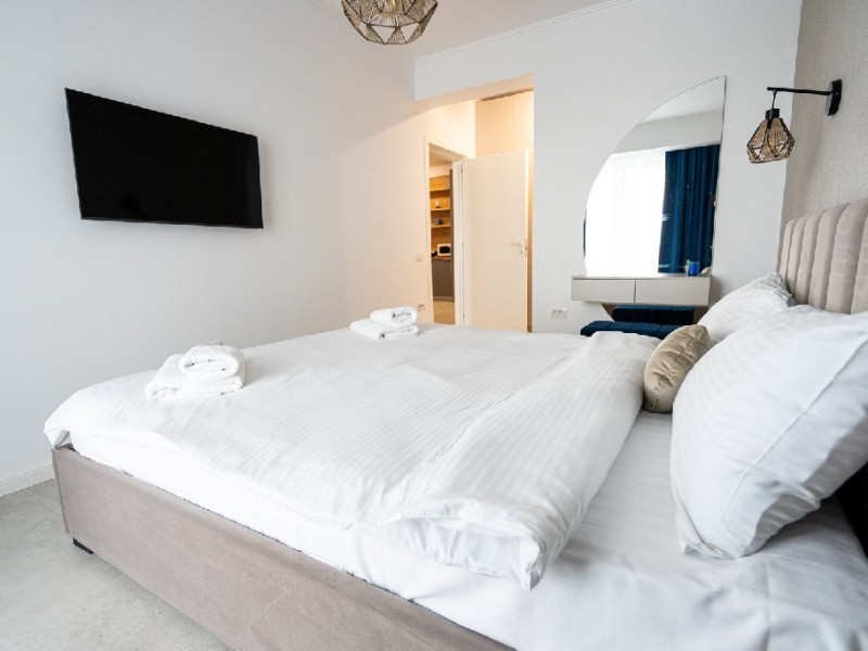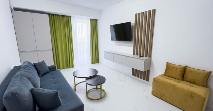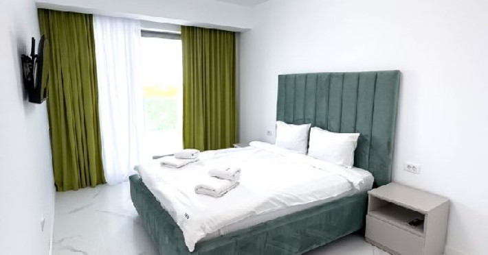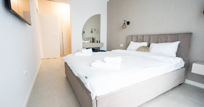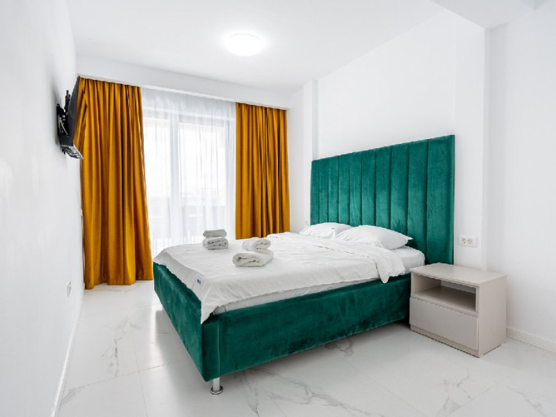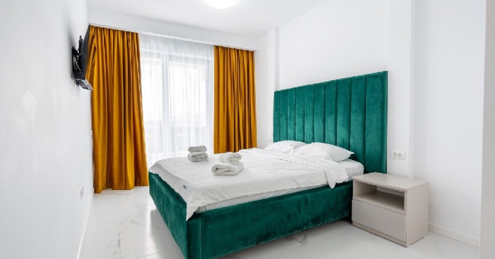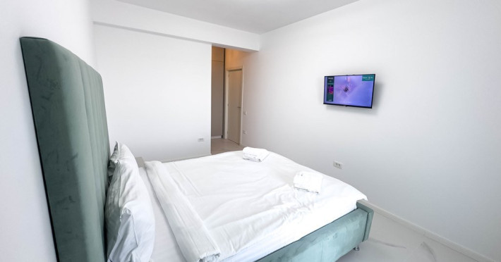 Apartament cu 2 camere, vedere laterala la mare Apartamentele de acest tip au 2 camere (dormitor cu pat matrimonial si living cu canapea extensibila). Capacitate maxima: 4 persoane. Dotari si facilitati: bucatarie de tip open space, complet mobilata si utilata (frigider, plita cu inductie, cuptor cu microunde, espressor de cafea cu cafea boabe/ capsule, vesela, tacamuri). Toate apartamentele au aer conditionat, TV LED cu conexiune cablu TV, acces Internet Wi-Fi gratuit, suport uscator de rufe, masa de calcat si fier de calcat, uscator de par, mobilier pe balcoane/ terase.