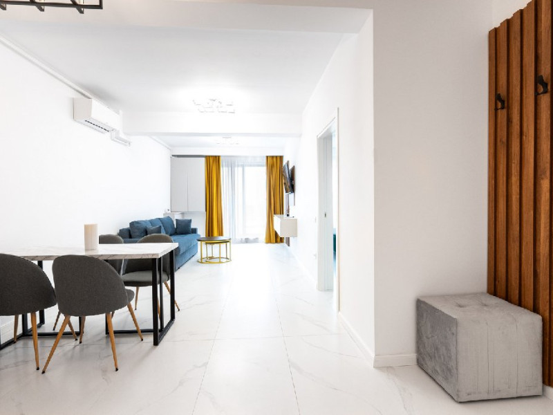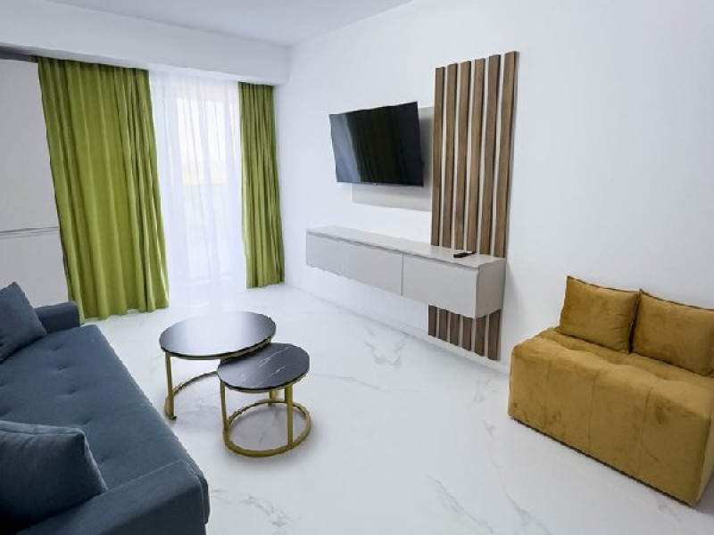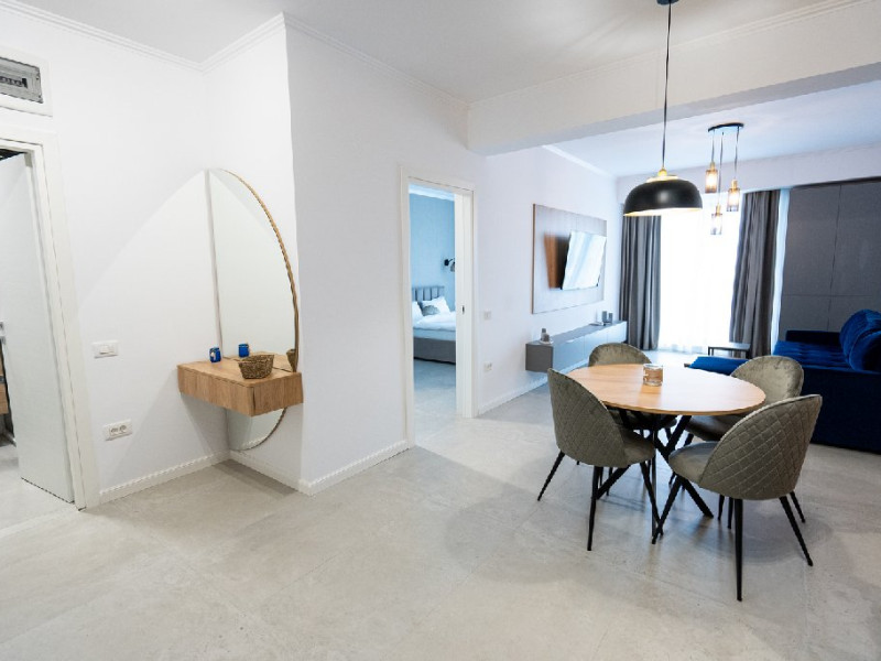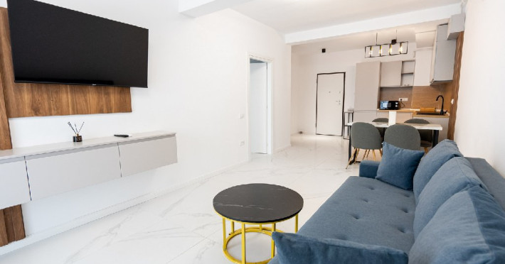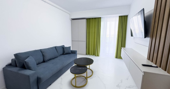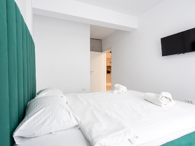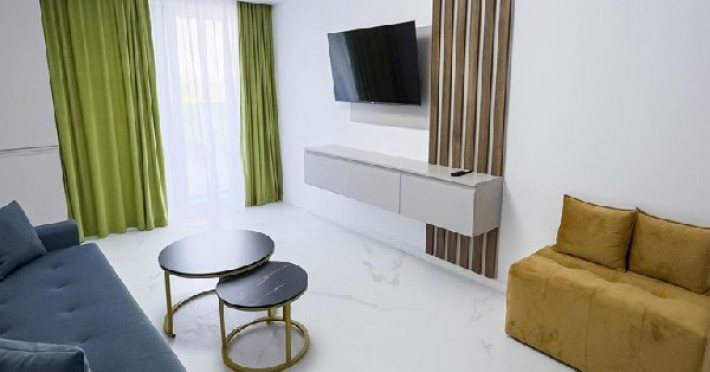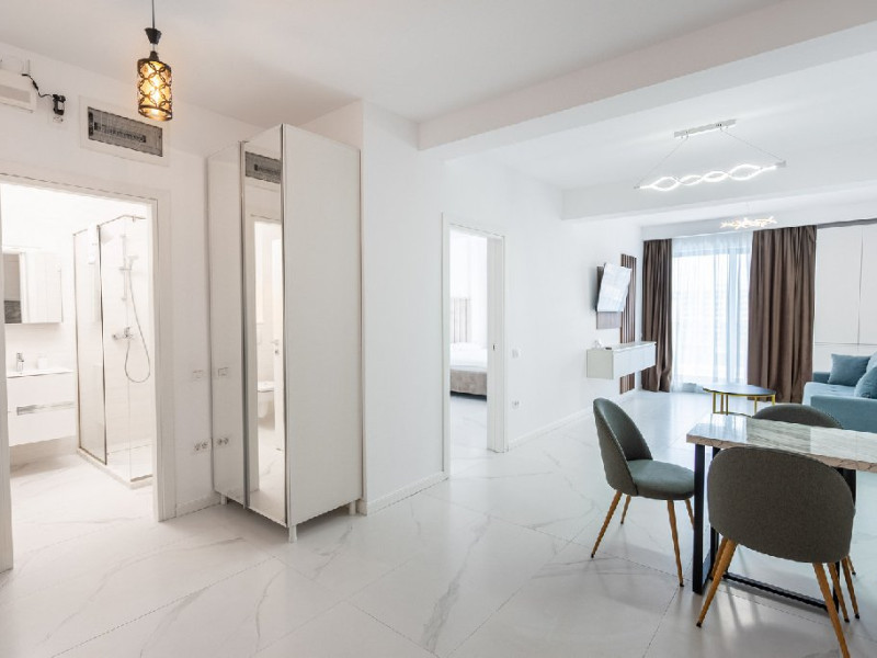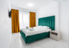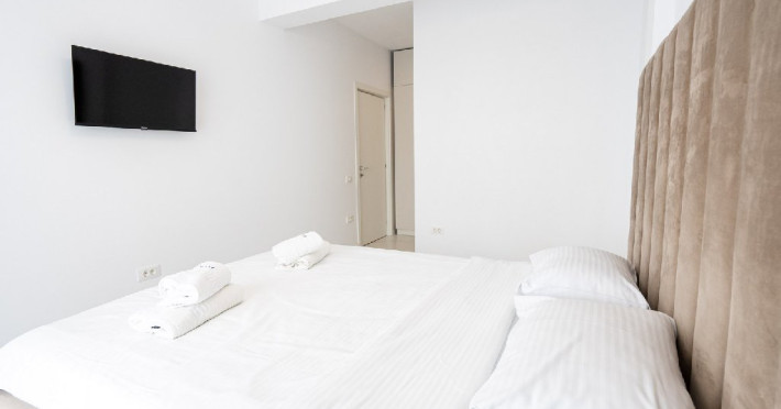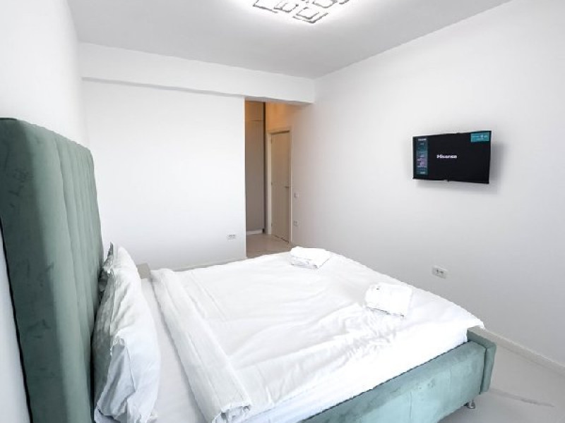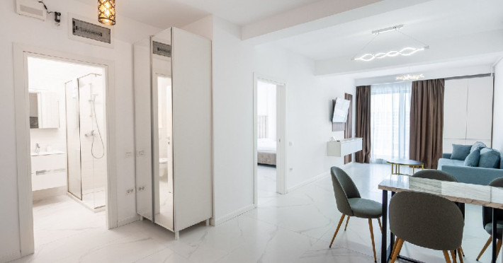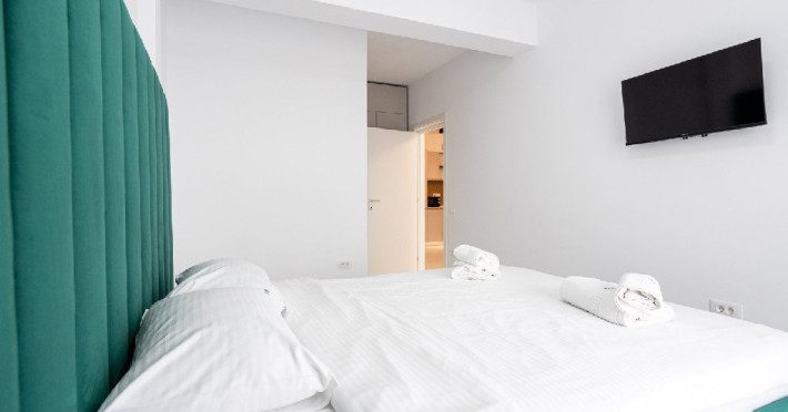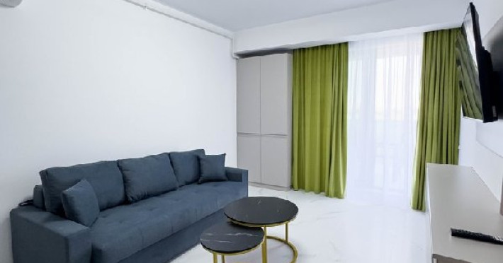 Apartament cu 2 camere, vedere laterala la mare Apartamentele de acest tip au 2 camere (dormitor cu pat matrimonial si living cu canapea extensibila). Capacitate maxima: 4 persoane. Dotari si facilitati: bucatarie de tip open space, complet mobilata si utilata (frigider, plita cu inductie, cuptor cu microunde, espressor de cafea cu cafea boabe/ capsule, vesela, tacamuri). Toate apartamentele au aer conditionat, TV LED cu conexiune cablu TV, acces Internet Wi-Fi gratuit, suport uscator de rufe, masa de calcat si fier de calcat, uscator de par, mobilier pe balcoane/ terase.