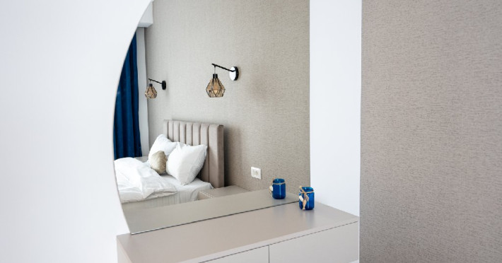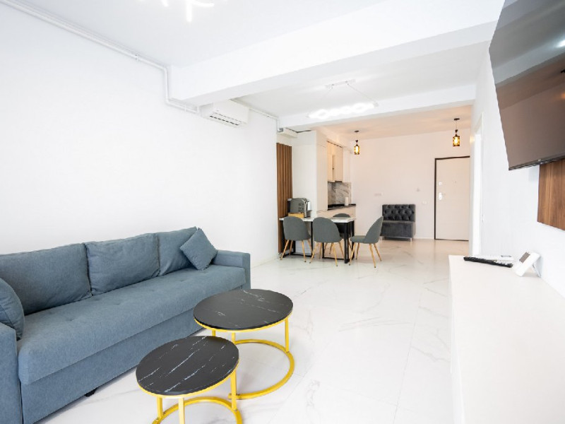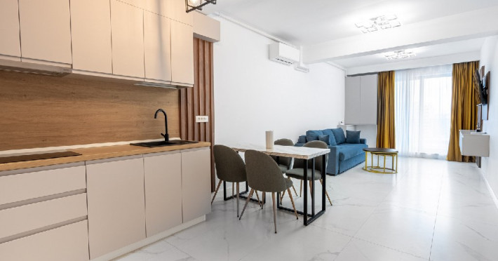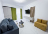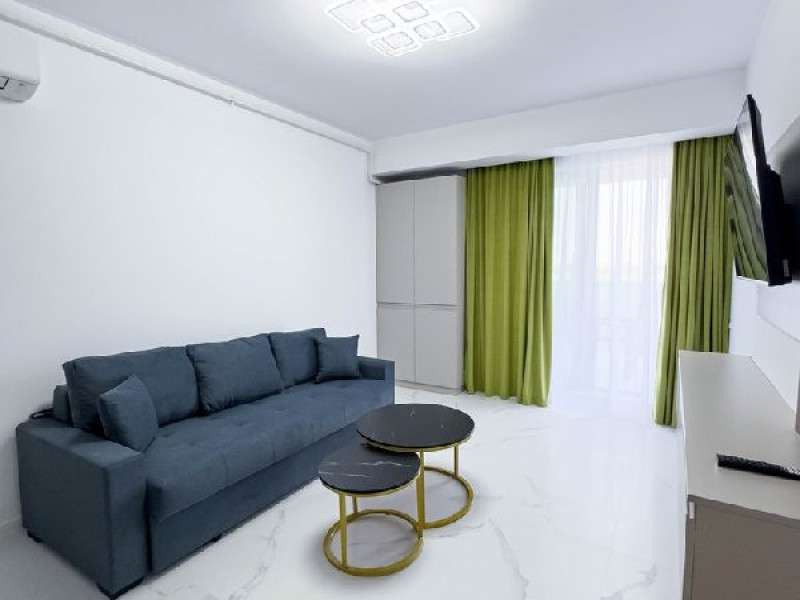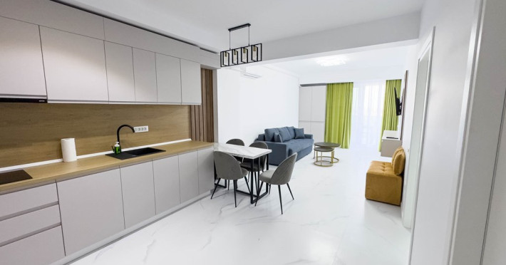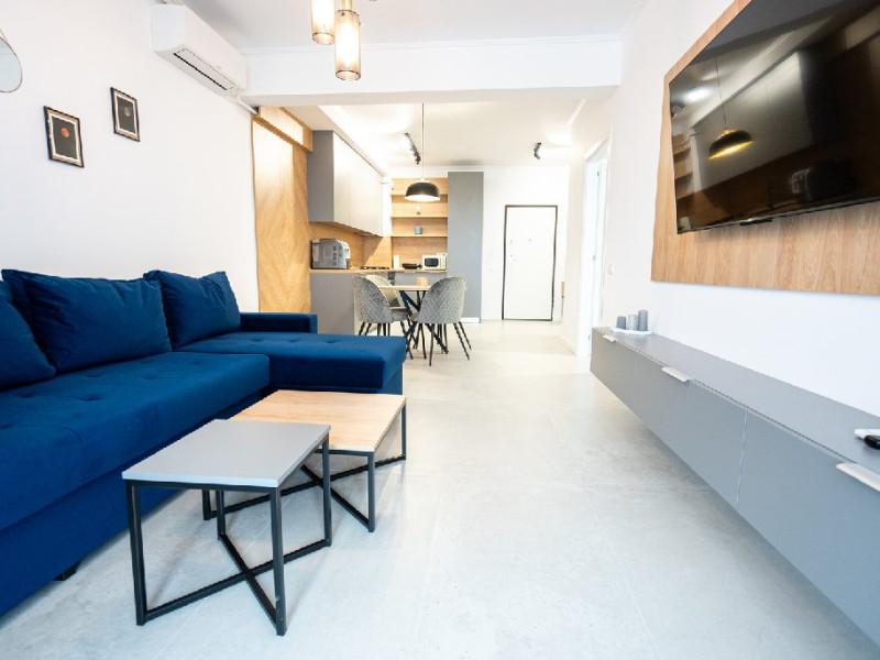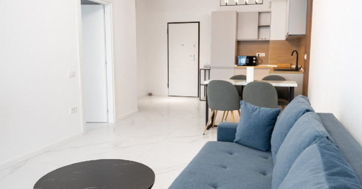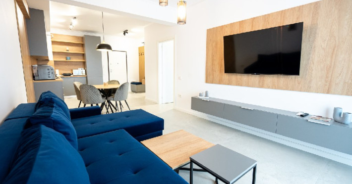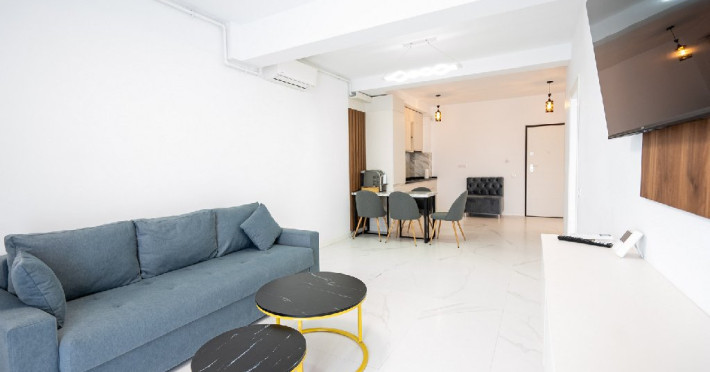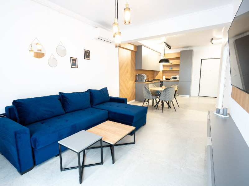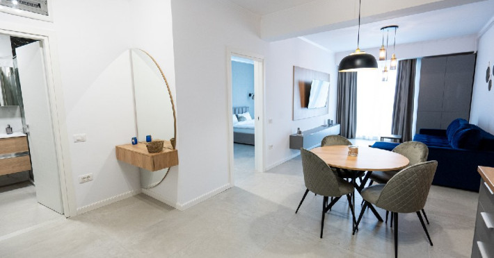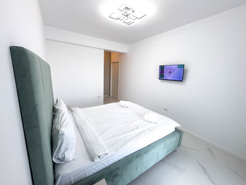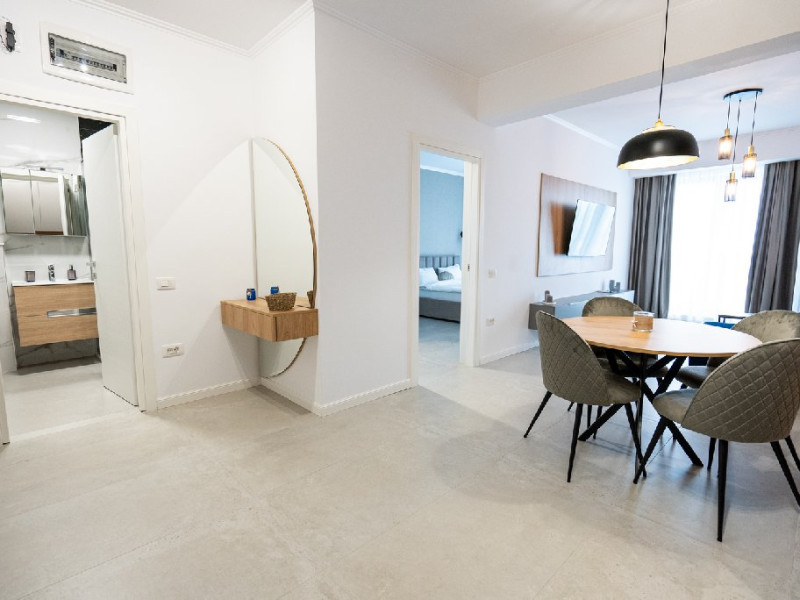 Apartament cu 2 camere, vedere laterala la mare Apartamentele de acest tip au 2 camere (dormitor cu pat matrimonial si living cu canapea extensibila). Capacitate maxima: 4 persoane. Dotari si facilitati: bucatarie de tip open space, complet mobilata si utilata (frigider, plita cu inductie, cuptor cu microunde, espressor de cafea cu cafea boabe/ capsule, vesela, tacamuri). Toate apartamentele au aer conditionat, TV LED cu conexiune cablu TV, acces Internet Wi-Fi gratuit, suport uscator de rufe, masa de calcat si fier de calcat, uscator de par, mobilier pe balcoane/ terase.