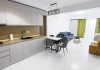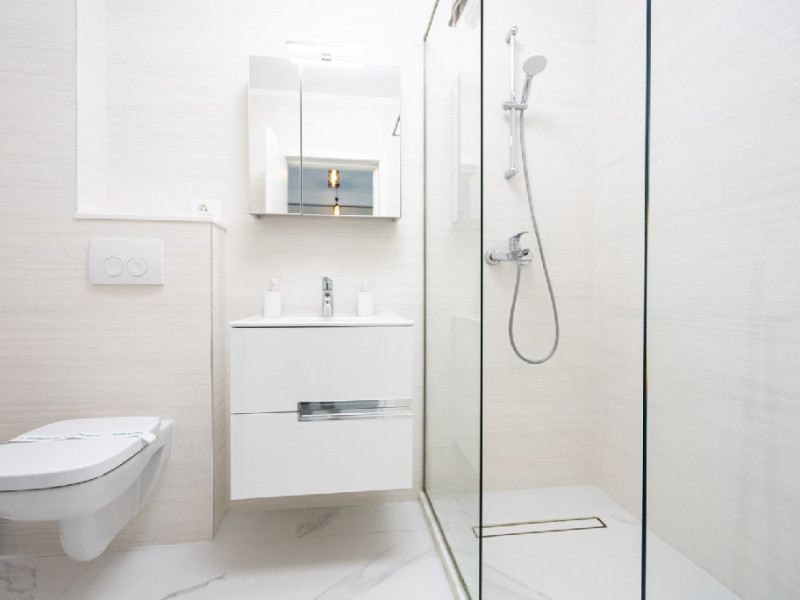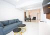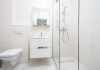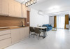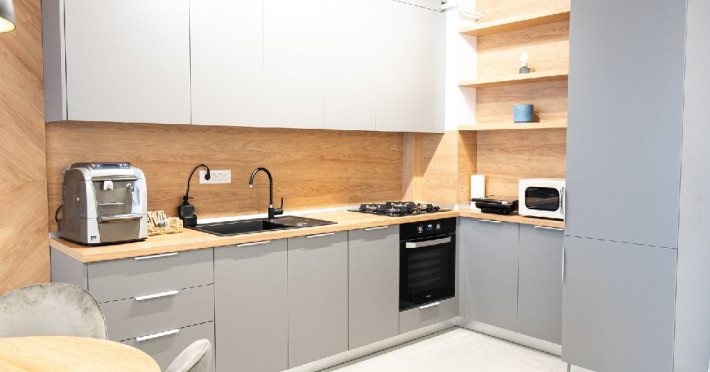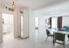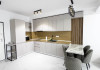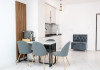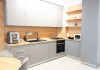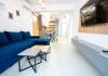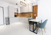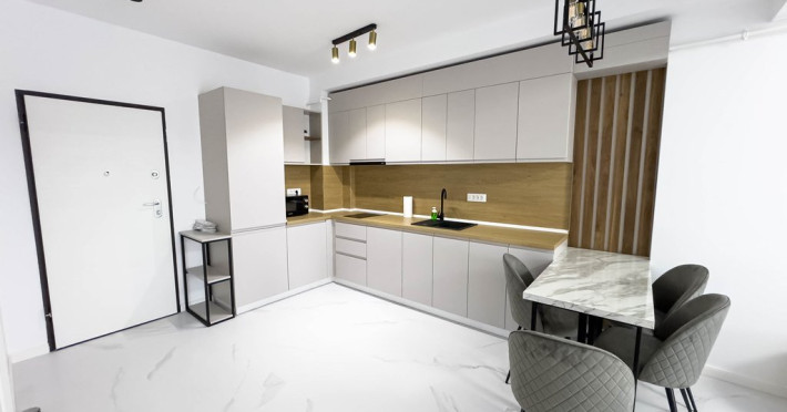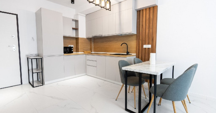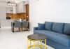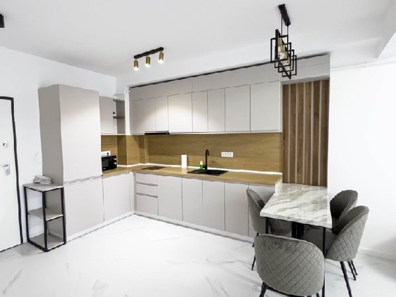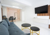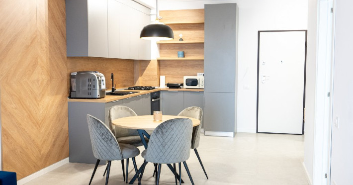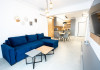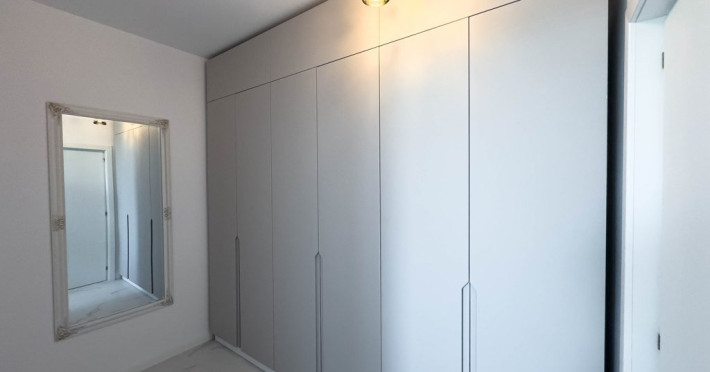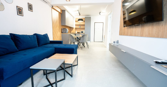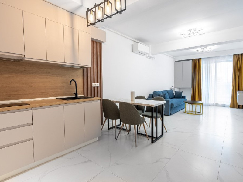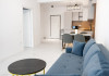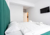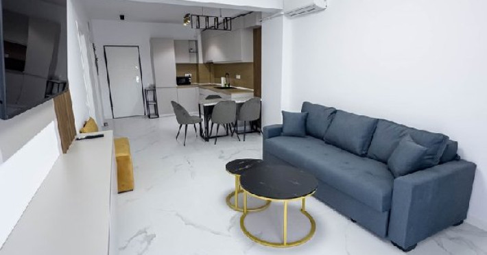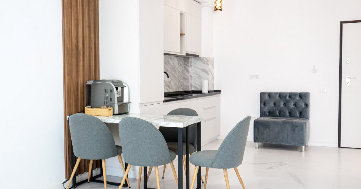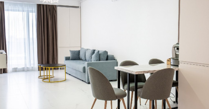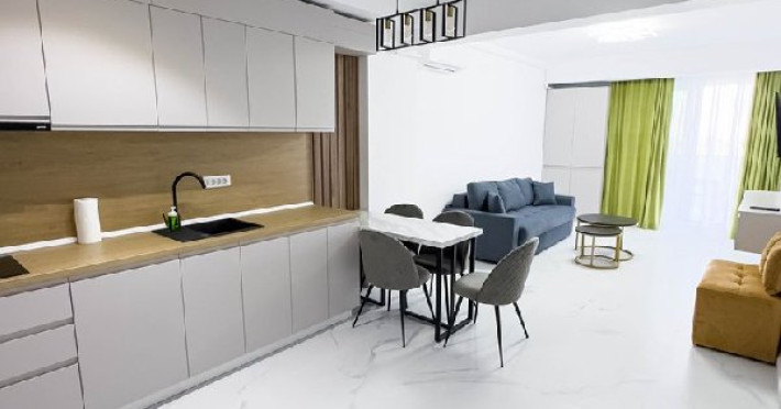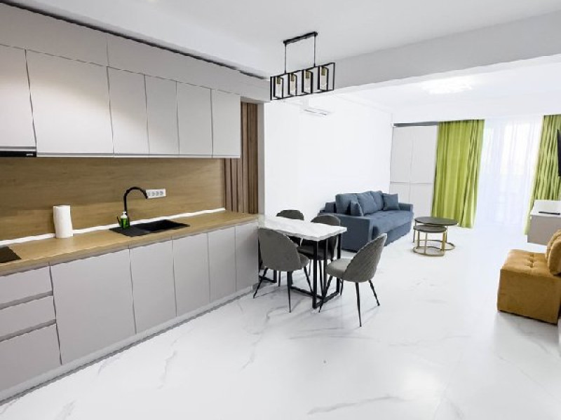 Apartament cu 2 camere, vedere laterala la mare Apartamentele de acest tip au 2 camere (dormitor cu pat matrimonial si living cu canapea extensibila). Capacitate maxima: 4 persoane. Dotari si facilitati: bucatarie de tip open space, complet mobilata si utilata (frigider, plita cu inductie, cuptor cu microunde, espressor de cafea cu cafea boabe/ capsule, vesela, tacamuri). Toate apartamentele au aer conditionat, TV LED cu conexiune cablu TV, acces Internet Wi-Fi gratuit, suport uscator de rufe, masa de calcat si fier de calcat, uscator de par, mobilier pe balcoane/ terase.